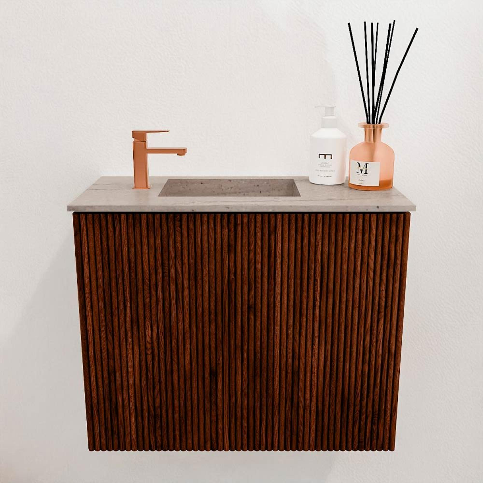 La combinaison d’une façade en chêne massif avec une couleur Ruby chaude donne à ce meuble une apparence intemporelle et élégante. Le bois naturel crée une atmosphère authentique, tandis que la couleur Ruby ajoute une teinte profonde et riche qui donne un caractère supplémentaire à votre salle de bains. La vasque dans la teinte douce Saba forme un contraste subtil et complète l’ensemble. Vous obtenez ainsi un meuble qui n’est pas seulement fonctionnel, mais aussi un véritable point de mire dans votre salle de bains ou espace toilettes.