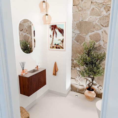 Transformez votre salle de bains avec ce magnifique meuble qui est non seulement pratique, mais aussi un véritable élément décoratif. Grâce à son format compact, il s'adapte parfaitement aux petits espaces, sans compromettre le style ni la fonctionnalité. La couleur chaude Ruby donne à votre salle de bains une apparence luxueuse, tandis que la combinaison de chêne massif et de placage chêne crée une ambiance naturelle et durable. Le meuble est conçu pour être suspendu au mur, ce qui vous laisse plus d'espace au sol et garde la pièce aérée. La vasque assortie avec un trou de robinet central complète l'ensemble et vous offre tout le confort nécessaire pour votre routine quotidienne. Ainsi, vous profitez chaque jour d'une salle de bains qui est non seulement belle, mais aussi parfaitement adaptée à vos souhaits et à votre style de vie.