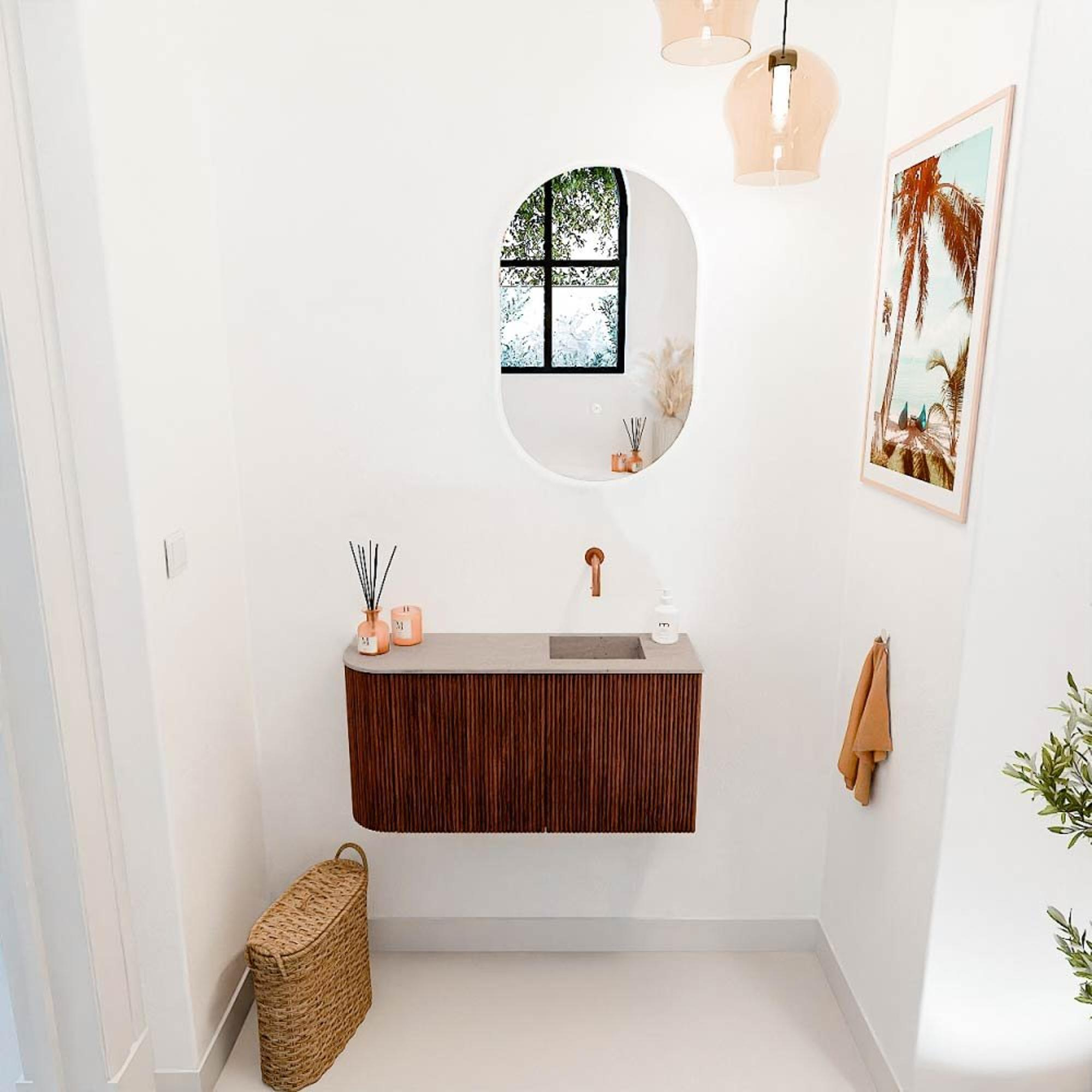Ce meuble se distingue immédiatement par son apparence élégante. L'association du chêne massif avec une couleur Ruby chaleureuse lui confère un aspect naturel et luxueux qui améliore instantanément votre salle de bains. L'arrondi subtil sur le côté gauche constitue un détail unique qui différencie ce meuble des modèles standards. La vasque couleur Saba s'harmonise parfaitement avec ce design, créant un ensemble harmonieux. Grâce à cette conception réfléchie, vous ajoutez un élément intemporel et élégant à votre espace, qui se combine facilement avec différents styles de salle de bains.