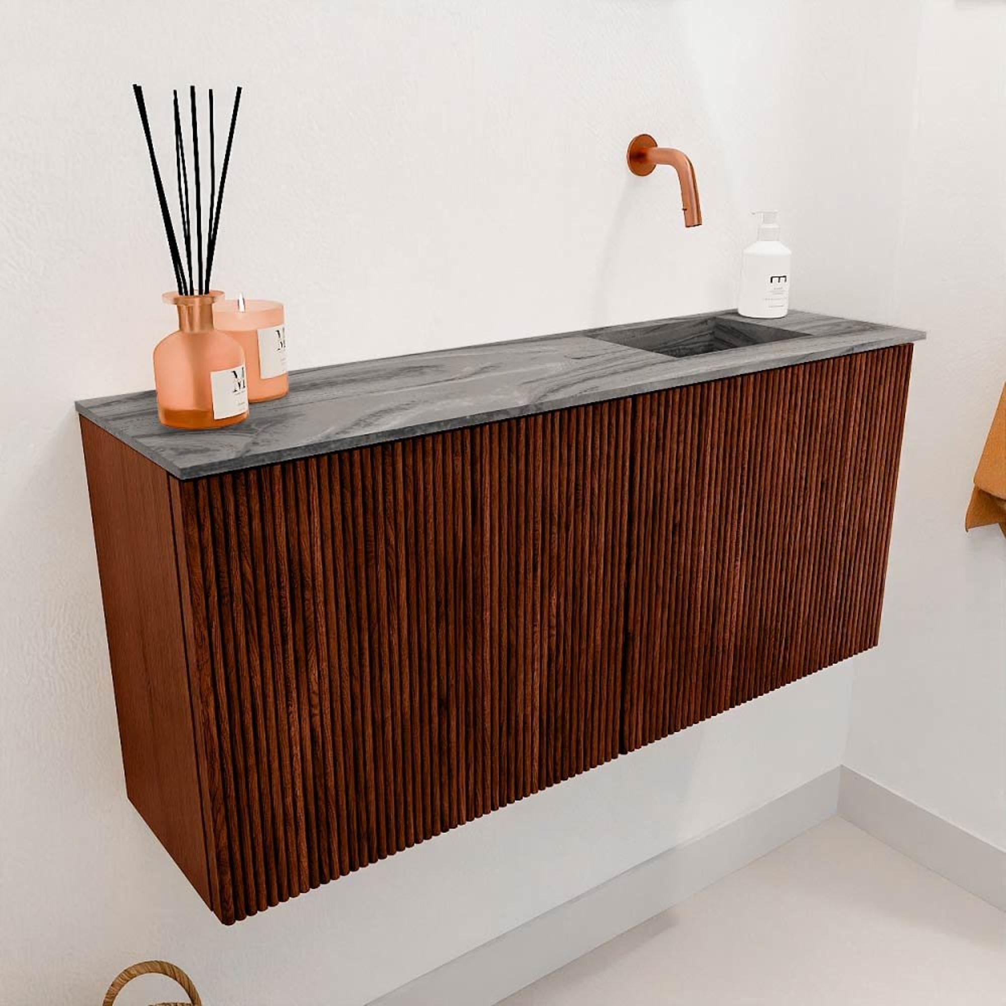 Le meuble se distingue immédiatement par sa couleur rouge rubis élégante et le motif raffiné de rainures verticales sur les façades. Cette combinaison unique donne à votre salle de bains une apparence luxueuse sans dominer. La vasque grise couleur Sombra forme un contraste subtil qui attire l'attention tout en dégageant une sensation de calme. Grâce aux lignes droites et au design minimaliste, ce meuble s'intègre parfaitement dans les salles de bains modernes et classiques. Avec ce meuble, vous ajoutez une touche de raffinement qui vous inspirera chaque jour.