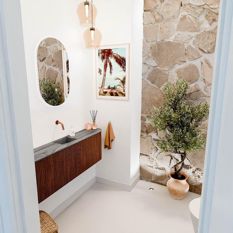 Cette magnifique combinaison de meuble et vasque apporte immédiatement ambiance et style à votre salle de bains ou toilettes d'invités. Avec sa largeur généreuse de 123,2 cm et la couleur chaude et remarquable Ruby du meuble, vous créez un véritable élément accroche-regard qui est en même temps fonctionnel. Les courbes subtiles sur les côtés gauche et droit donnent à l'ensemble une apparence douce et élégante, ce qui fait que le meuble s'adapte parfaitement aux intérieurs modernes et chaleureux. La vasque de couleur Sombra ajoute une teinte calme et naturelle qui contraste joliment avec le meuble et assure un look équilibré. Grâce à la conception réfléchie sans trou de robinet, vous pouvez choisir vous-même quel robinet correspond le mieux à votre style et à vos souhaits. Ce meuble rend votre salle de bains non seulement plus belle, mais aussi plus pratique et agréable à utiliser. Ainsi, vous profitez chaque jour d'un espace soigné et accueillant.Stylé