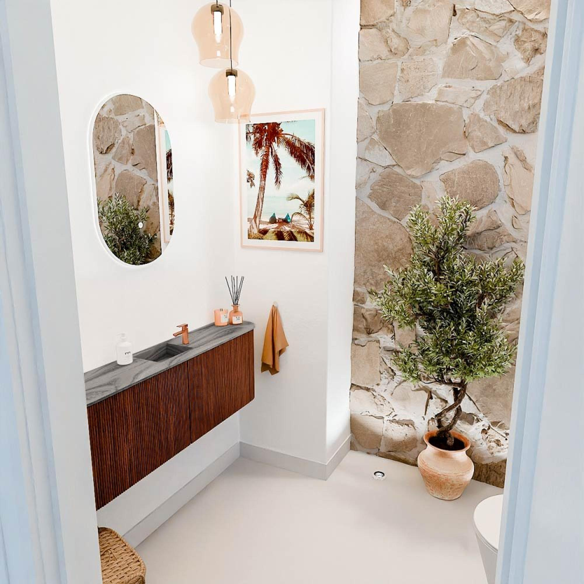La combinaison du chaleureux Ruby et du subtil Sombra offre une apparence intemporelle et élégante. Les coins arrondis donnent au meuble une touche douce et moderne qui s'intègre sans effort dans différents styles de salle de bains. Que vous aimiez un intérieur épuré et minimaliste ou que vous souhaitiez créer une ambiance plus classique, ce meuble ajoute toujours une dimension stylée. Grâce aux couleurs et formes soigneusement choisies, votre salle de bains paraît immédiatement accueillante et soignée, contribuant à une sensation de détente et de luxe.