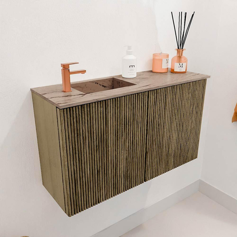 La combinaison de chêne massif à l'avant et de placage chêne sur les côtés donne à ce meuble une apparence naturelle et luxueuse. La couleur Dusk crée une ambiance chaleureuse et calme qui s'intègre facilement dans des salles de bains modernes ou classiques. Grâce au design minimaliste aux lignes épurées, le meuble reste intemporel et élégant. Cela en fait un véritable point fort qui donne à votre salle de bains une mise à niveau exclusive. De plus, la vasque placée à gauche apporte un accent ludique et unique, donnant à votre salle de bains ce petit plus de caractère.