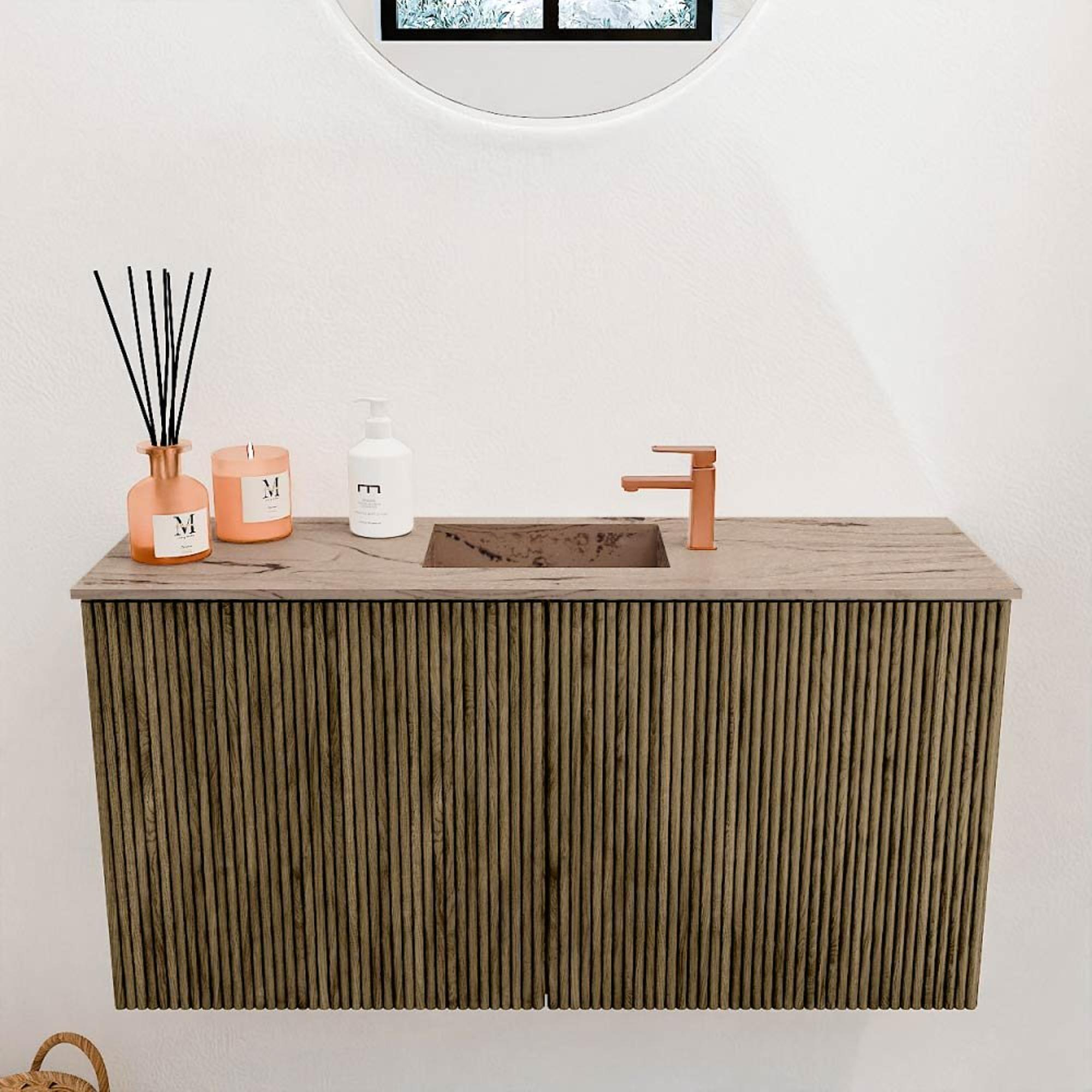Le meuble se distingue immédiatement par l'utilisation de chêne massif de haute qualité avec une couleur chaude Dusk. Les rainures verticales lui confèrent une apparence raffinée à la fois moderne et naturelle. Cette combinaison fait du meuble un véritable point de mire dans votre salle de bains. La vasque couleur Arena avec un trou de robinet placé au centre ajoute un contraste subtil, rendant l'ensemble harmonieux et accueillant. Ainsi, vous profitez d'une salle de bains qui n'est pas seulement fonctionnelle, mais aussi esthétiquement parfaite selon votre goût.