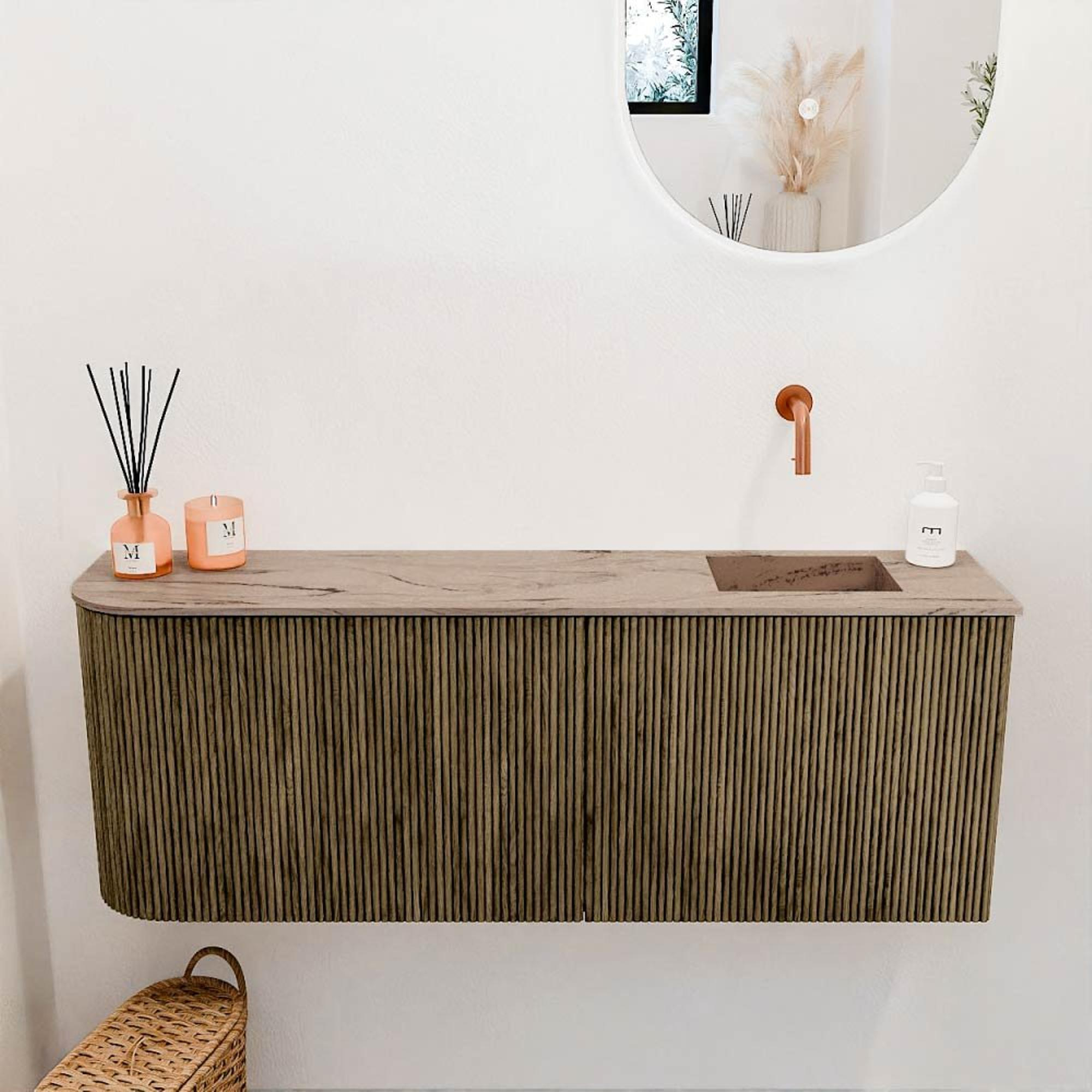 La combinaison de façades en chêne massif avec des panneaux latéraux en placage chêne dans la couleur chaude Dusk fait de ce meuble un véritable accroche-regard. L'arrondi subtil sur le côté gauche donne à l'ensemble un aspect ludique et pourtant raffiné. Ce meuble s'intègre parfaitement dans des salles de bains modernes et naturelles, où l'ambiance et l'élégance sont centrales. Grâce à la finition de haute qualité, le meuble conserve son charme et son aspect, même après des années d'utilisation. Ainsi, vous ajoutez un élément intemporel à votre salle de bains, qui se combine sans effort avec différents styles.