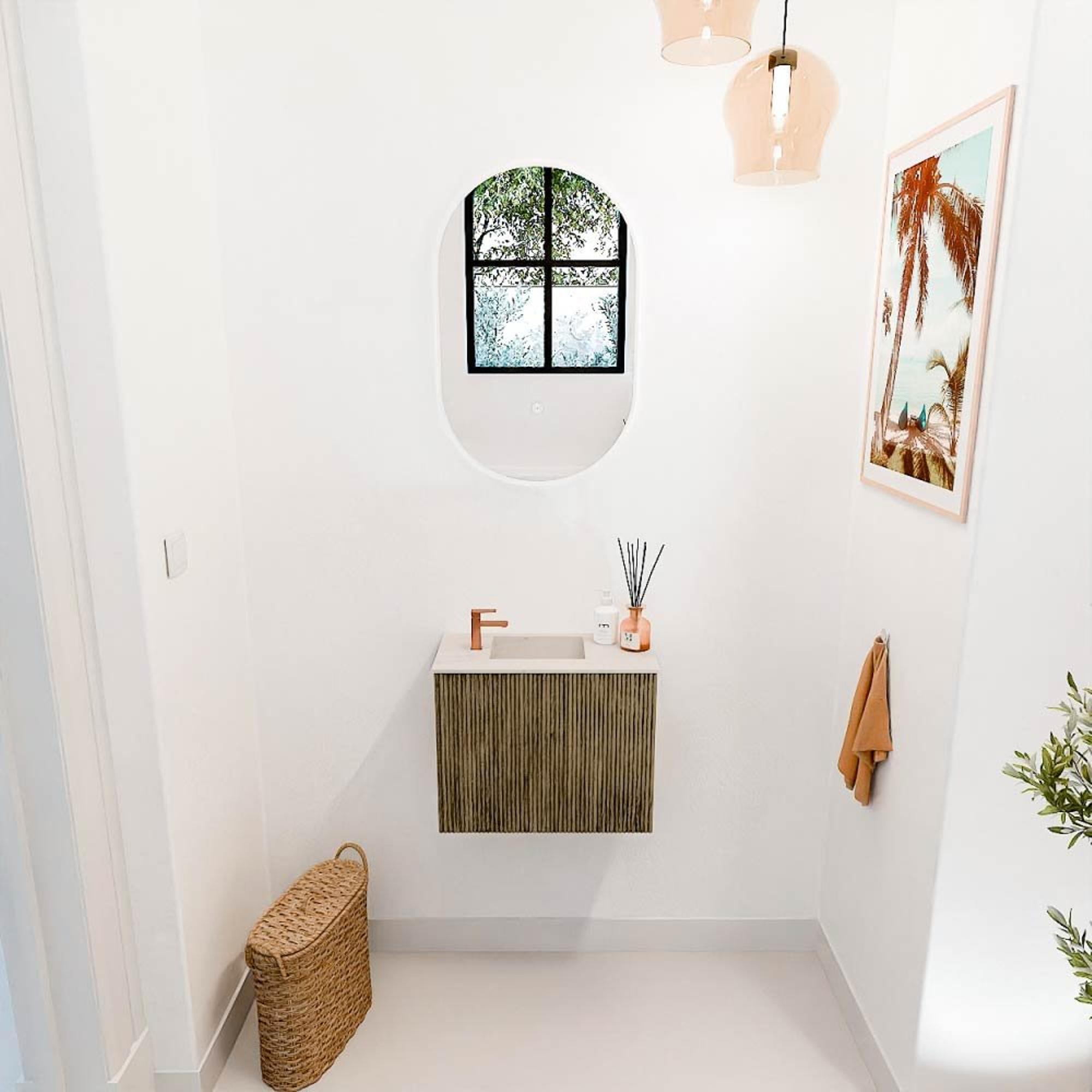 Avec ce meuble compact et élégant, vous offrez une mise à niveau immédiate à vos toilettes. Il combine une apparence chaleureuse et naturelle avec une disposition pratique, rendant votre salle de bains non seulement plus belle mais aussi plus fonctionnelle. Grâce au bois de chêne massif de haute qualité couleur Dusk, le meuble dégage calme et élégance, tandis que la vasque avec trou de robinet positionné à gauche s'adapte parfaitement à votre confort d'utilisation. Ce meuble s'intègre facilement dans les petits espaces, tout en offrant suffisamment de rangement pour garder vos articles de toilette propres et hors de vue. Ainsi, vous créez une ambiance soignée et accueillante dont vous profiterez chaque jour.