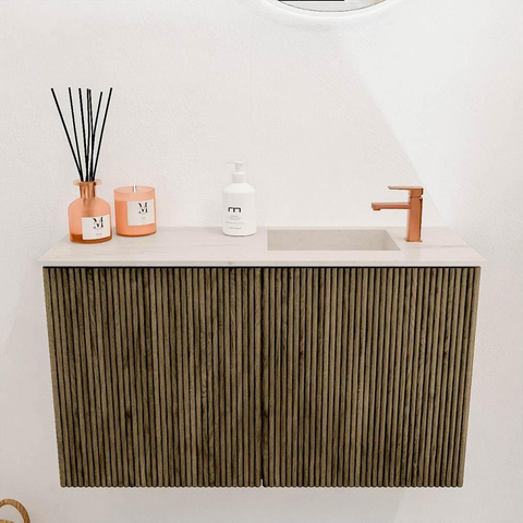 Le meuble se distingue immédiatement par son apparence élégante et intemporelle. La couleur bois chaude 'Dusk' apporte une atmosphère naturelle à votre salle de bains, à la fois apaisante et moderne. Les lignes épurées et le design minimaliste permettent au meuble de s'adapter facilement à différents styles d'intérieur, du scandinave à l'industriel. La combinaison avec la vasque dans la douce couleur 'Meli' crée un contraste subtil qui donne un caractère supplémentaire à l'ensemble. Ainsi, vous profitez non seulement d'un meuble fonctionnel, mais aussi d'un véritable élément accroche-regard qui donne à votre salle de bains une allure luxueuse.