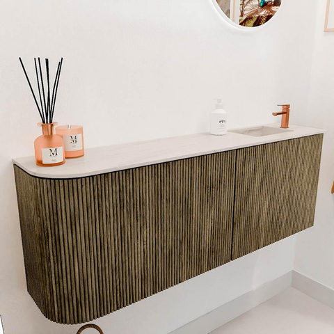 Ce meuble se distingue immédiatement par son design raffiné et sa palette de couleurs chaleureuse. La couleur Dusk offre une apparence contemporaine mais intemporelle qui s'intègre aisément dans différents styles de salles de bains. Le côté arrondi à gauche ajoute un élément ludique et doux, rendant le meuble à la fois épuré et accueillant. La combinaison d'accents bois naturels et d'une vasque moderne couleur Meli crée un ensemble harmonieux qui donne à votre salle de bains une allure luxueuse. Vous créez ainsi un espace dont vous êtes fier et où vous vous sentez bien chaque jour.
