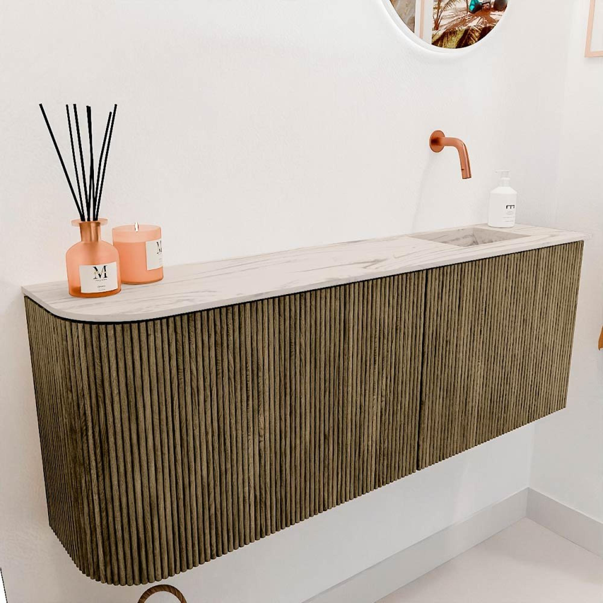 La combinaison de la couleur chaude et sombre Dusk avec la vasque claire en Nata fait de ce meuble un véritable point focal. L'arrondi doux sur le côté gauche donne à l'ensemble un aspect unique et moderne qui s'intègre facilement dans différents styles d'intérieur. Ainsi, vous n'ajoutez pas simplement un meuble, mais un élément stylé qui donne à votre salle de bains une atmosphère contemporaine et luxueuse. Grâce au design subtil, l'espace paraît immédiatement accueillant et personnel.