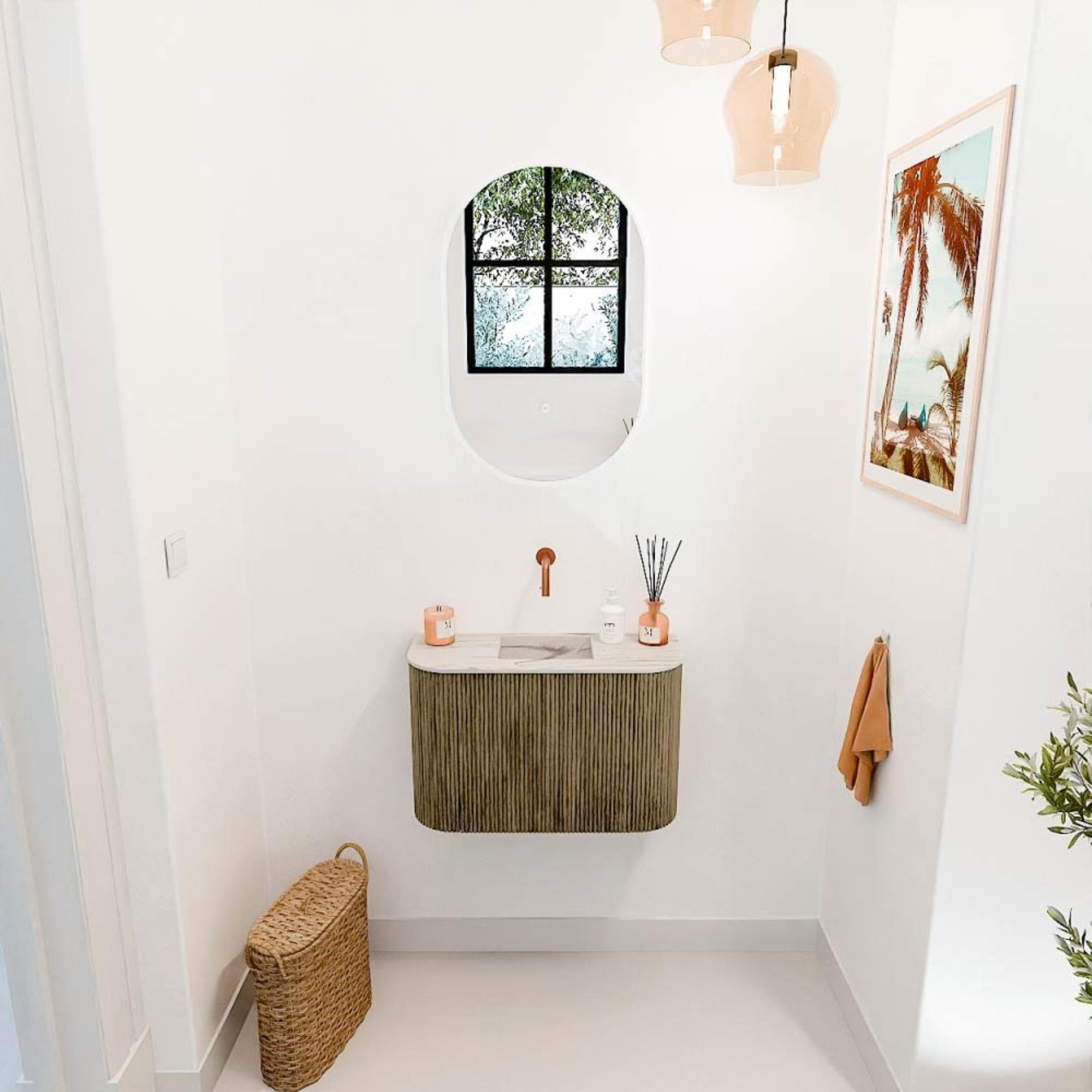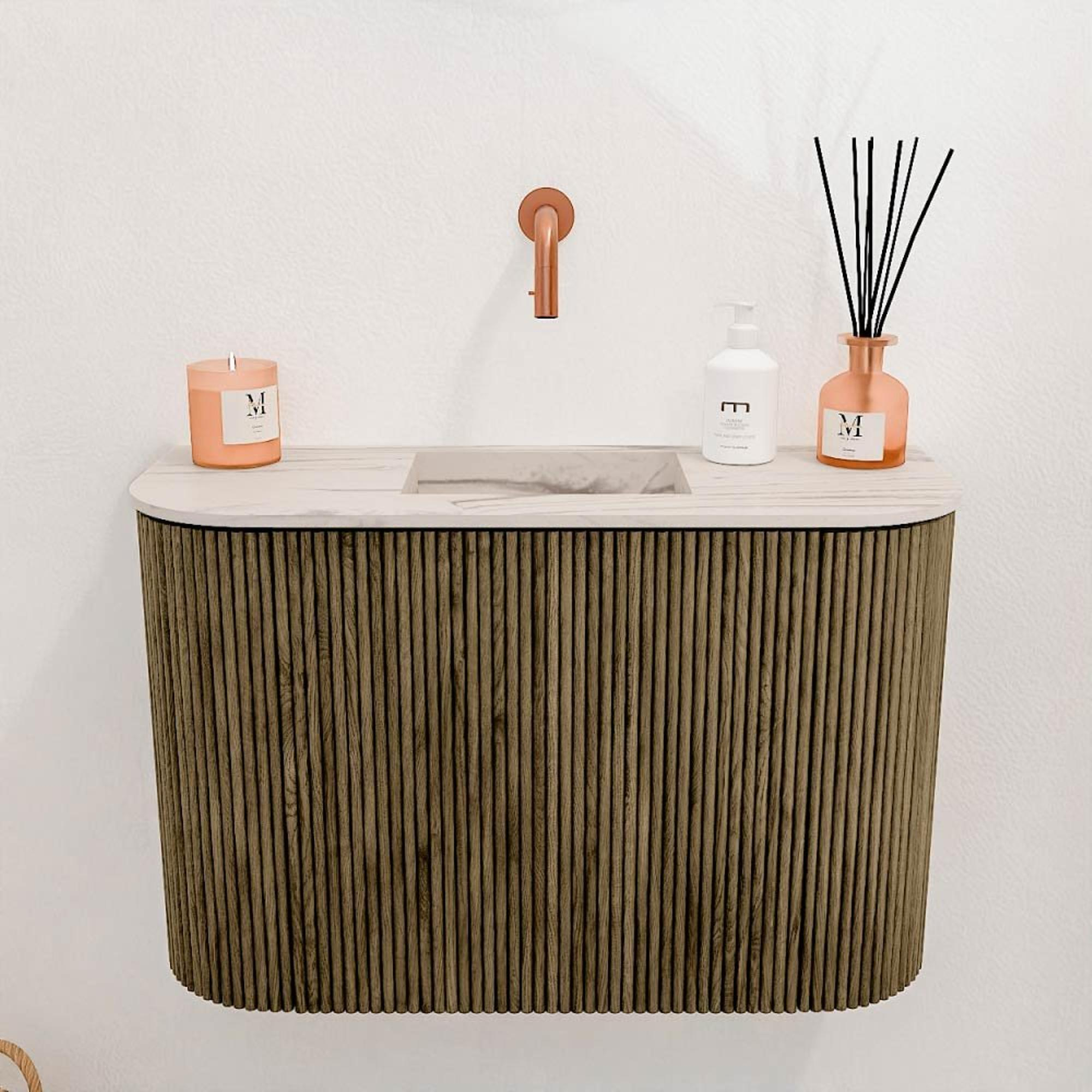 Les arrondis uniques des deux côtés du meuble lui confèrent un caractère particulier et raffiné. La couleur Dusk est profonde et intemporelle, ce qui permet au meuble de s'adapter sans effort à différents styles de salle de bains. Que vous aimiez un aménagement épuré et moderne ou que vous souhaitiez créer une ambiance chaleureuse et naturelle, ce meuble s'ajuste à vos souhaits. Le contraste subtil avec la vasque en Nata rend l'ensemble encore plus attrayant et assure une apparence fraîche. Vous profitez ainsi d'une salle de bains qui non seulement est belle, mais aussi un véritable point de mire.