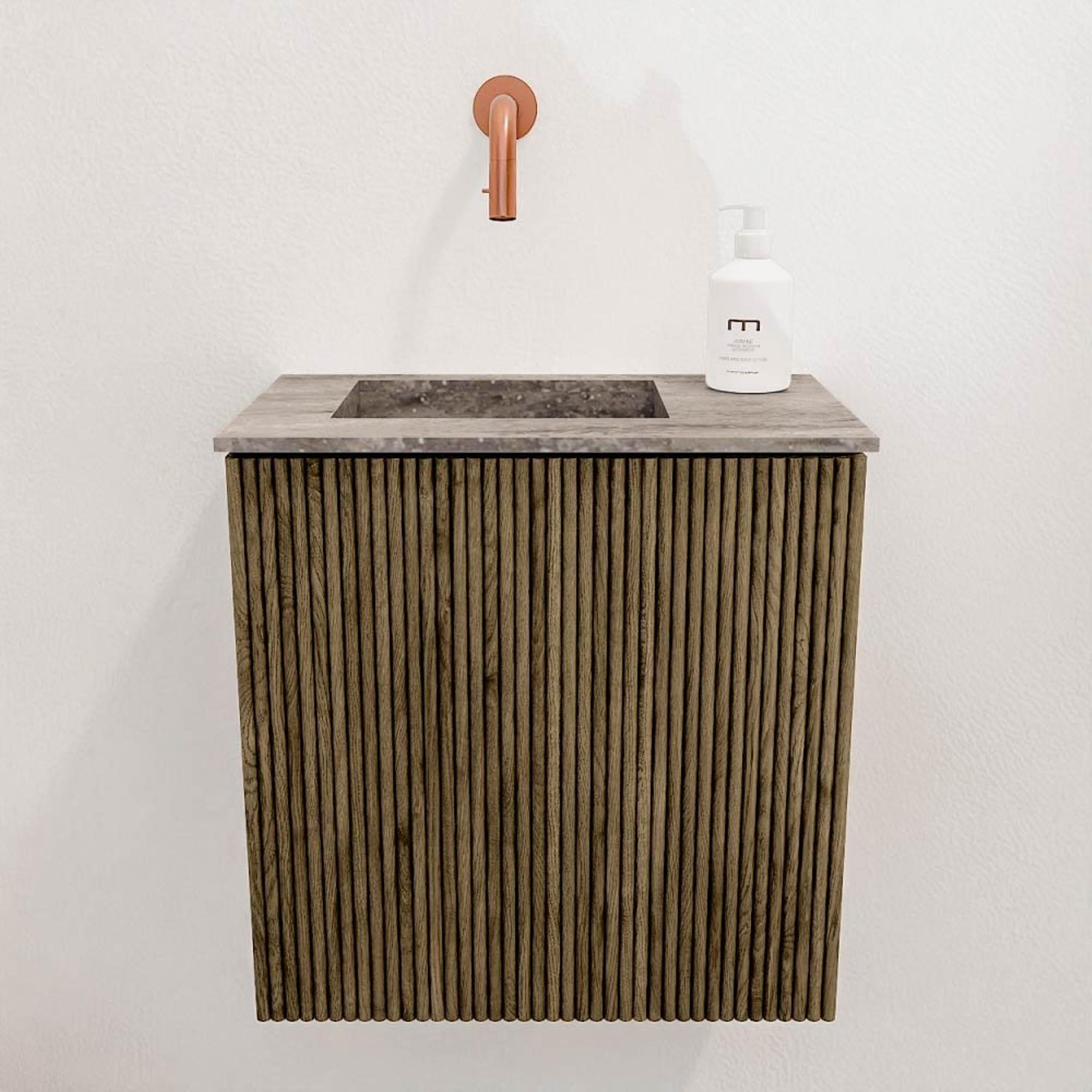 Avec ce meuble compact et élégant, vous donnez immédiatement à vos toilettes d'invités une ambiance chaleureuse et accueillante. Le meuble combine un aspect bois naturel de couleur Dusk avec une vasque au design épuré qui s'harmonise parfaitement avec les intérieurs modernes. Grâce à sa conception intelligente d'une largeur de 40 cm, il s'intègre sans effort dans les petits espaces sans sacrifier la fonctionnalité. Le meuble est monté au mur, ce qui crée non seulement un effet d'espace, mais facilite également le nettoyage du sol. La vasque est positionnée à gauche et ne comporte pas de trou de robinet, vous laissant ainsi la liberté de choisir un robinet qui correspond exactement à votre style et à vos besoins. Vous créez ainsi une solution personnelle et pratique qui donne à votre salle de bains ou toilettes une apparence soignée et de haute qualité.