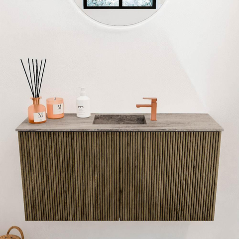 Le meuble se distingue immédiatement par son design raffiné avec des rainures verticales qui lui confèrent un aspect luxueux. La couleur Dusk apporte chaleur et caractère à votre salle de bains, en faisant un véritable point focal. Ce meuble s'intègre parfaitement dans des intérieurs modernes comme classiques et ajoute une touche subtile et naturelle. La combinaison du mélaminé à l'aspect bois et de la vasque épurée de couleur Oza crée un ensemble harmonieux qui dégage calme et style. Vous profitez ainsi non seulement d'un meuble fonctionnel, mais aussi d'un design qui complète parfaitement votre salle de bains.