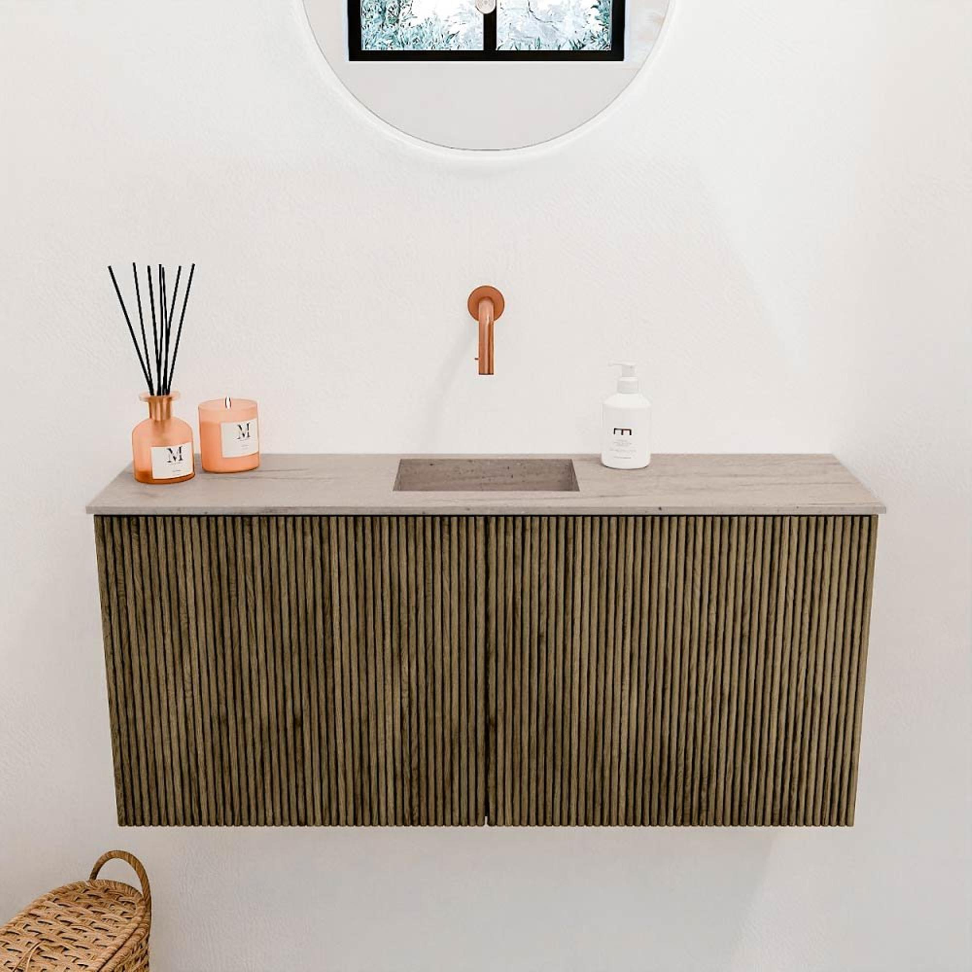 La combinaison de chêne massif et de placage de chêne dans une teinte chaude Dusk assure une apparence intemporelle et luxueuse. La structure nervurée verticale sur les panneaux frontaux confère au meuble un caractère unique et ajoute une texture subtile à votre salle de bains. Ce meuble n'est pas seulement fonctionnel