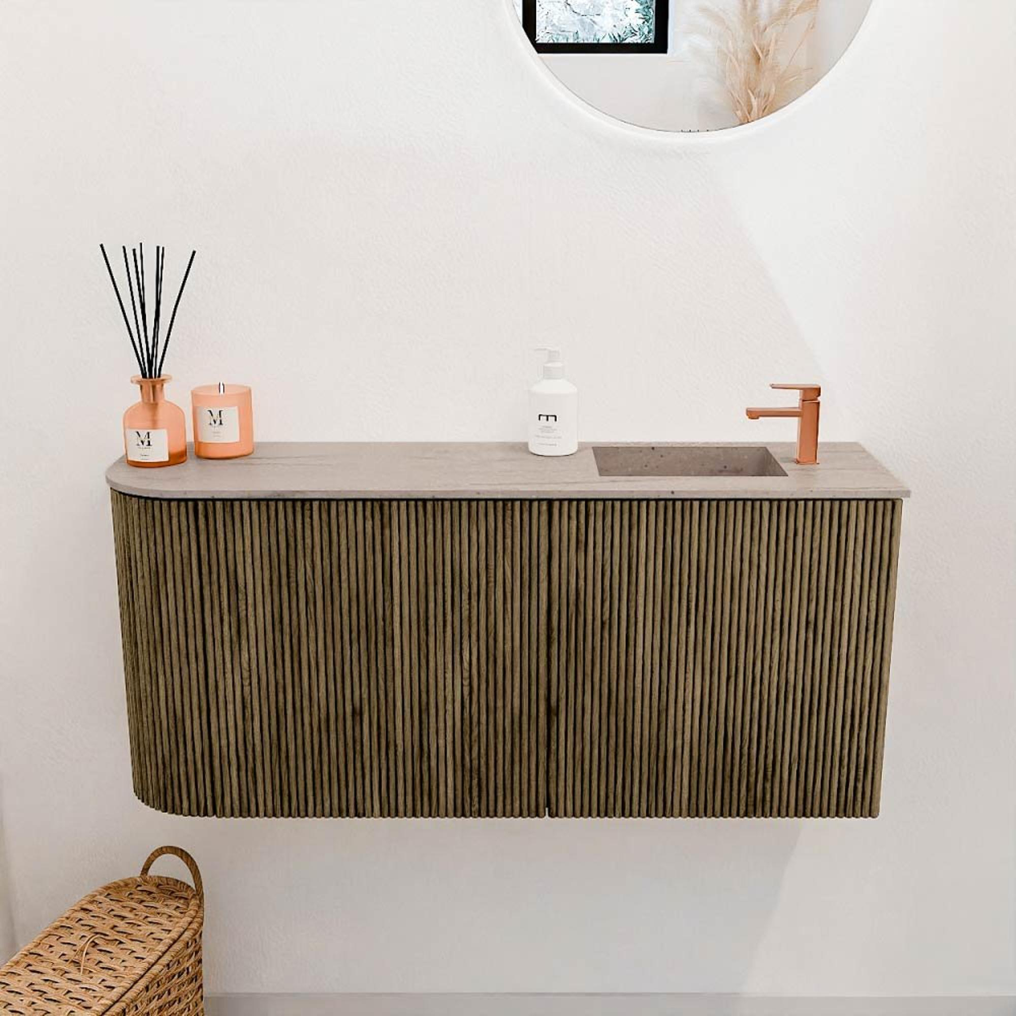 Le meuble se distingue immédiatement par sa combinaison raffinée de chêne massif et de placage de chêne, fini avec des rainures verticales qui ajoutent une texture subtile et de la profondeur. La couleur Dusk est une teinte chaude et neutre qui s’adapte sans effort à différents styles de salle de bains, du moderne au classique. Grâce à la conception réfléchie avec une forme arrondie sur le côté gauche, le meuble a une apparence douce qui invite au calme et au confort. Ainsi, vous créez une salle de bains qui n’est pas seulement fonctionnelle, mais aussi un véritable point fort visuel.