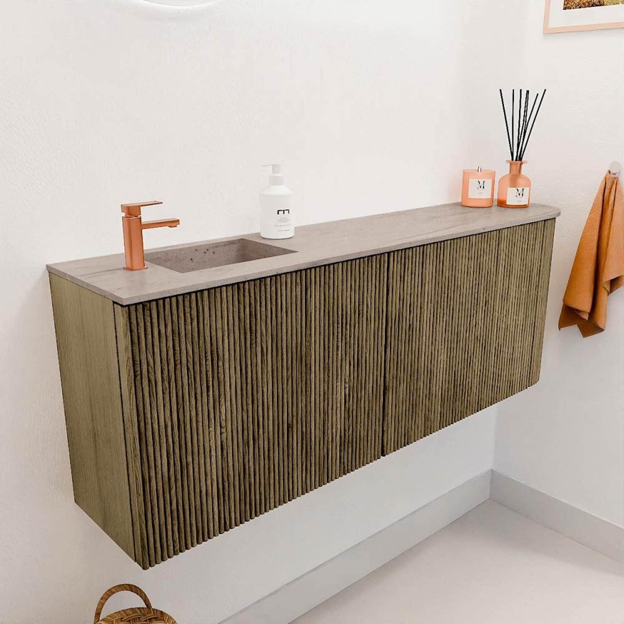 Le meuble se distingue immédiatement par son design raffiné et intemporel. Les rainures verticales apportent une texture subtile qui donne une touche moderne à l'ensemble, tandis que la couleur naturelle du bois en Dusk apporte chaleur et sérénité. Cette combinaison permet au meuble de s'intégrer sans effort dans différents styles d'intérieur, du classique au contemporain. Grâce au côté droit arrondi, le meuble possède un détail ludique qui le distingue des meubles de salle de bains standards. Vous ajoutez ainsi non seulement un élément fonctionnel, mais aussi un véritable point focal qui offre à vos toilettes d'invités une mise à niveau élégante.