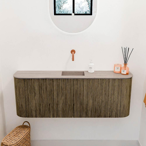 Ce meuble se distingue immédiatement par son design élégant. Les rainures verticales sur les façades apportent une texture subtile qui donne à l'ensemble un aspect moderne mais néanmoins intemporel. La combinaison de chêne massif avec placage de chêne offre un look naturel et chaleureux qui confère à votre salle de bains une ambiance exclusive. Grâce aux coins arrondis des deux côtés, le meuble paraît doux et accueillant, ce qui contribue à une expérience harmonieuse dans la salle de bains. Ainsi, vous ajoutez facilement un élément stylé à la fois fonctionnel et esthétiquement attrayant.
