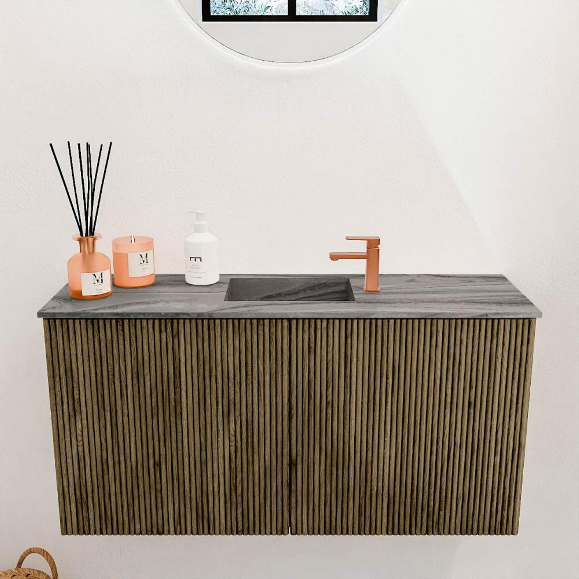 Ce meuble se distingue immédiatement par son design raffiné avec des rainures verticales et la couleur chaude Dusk. L'association de chêne massif et de placage chêne offre un aspect naturel et luxueux qui apporte une élégance intemporelle à votre salle de bains. Grâce à l'utilisation subtile des couleurs et aux lignes épurées, le meuble s'intègre sans effort dans les salles de bains modernes comme classiques. Vous créez ainsi une atmosphère harmonieuse qui dégage calme et confort. Le meuble est un véritable point de mire qui donne un coup de neuf à votre salle de bains sans dominer.
