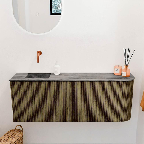 La combinaison de chêne massif et de placage chêne dans la couleur Dusk donne à ce meuble une apparence chaleureuse et naturelle qui attire immédiatement l’attention. Les rainures verticales ajoutent une texture subtile, conférant au meuble un design unique et moderne. Cela en fait non seulement un élément fonctionnel, mais aussi un véritable point fort dans votre salle de bains. Grâce à la finition arrondie sur le côté droit, le meuble paraît accueillant et invitant, contribuant à une atmosphère harmonieuse.Durable