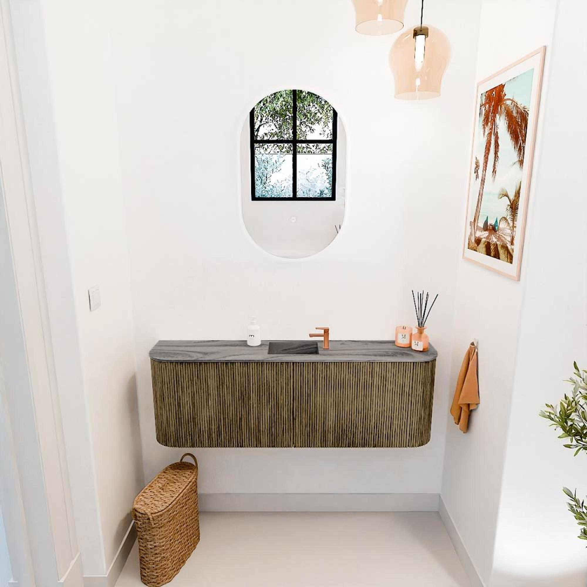 Les arrondis uniques sur les côtés gauche et droit donnent au meuble un caractère distinctif qui attire immédiatement l'attention. La couleur chaude Dusk crée une ambiance calme et naturelle qui s'harmonise facilement avec divers styles d'intérieur. La combinaison avec la vasque en Sombra crée un contraste élégant qui donne à votre salle de bains une apparence luxueuse. Ce meuble n'est pas simplement un élément fonctionnel, mais un véritable point focal qui enrichit votre espace d'une touche moderne et raffinée.