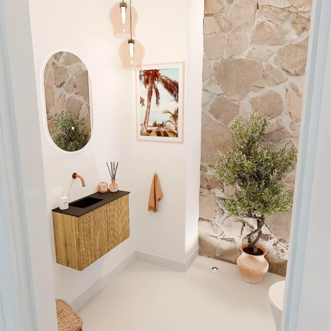 Avec ce magnifique meuble, vous donnez immédiatement à votre salle de bains une ambiance chaleureuse et naturelle. Il combine le charme intemporel du chêne massif avec un design moderne et épuré qui s'adapte parfaitement à divers styles d'intérieur. Grâce aux subtiles rainures verticales sur les panneaux de façade, le meuble acquiert un caractère ludique et élégant, tandis que ses dimensions compactes le rendent idéal pour les petites salles de bains ou toilettes. Le lavabo, stratégiquement placé à gauche, vous offre un grand confort d'utilisation sans que le meuble ne prenne trop de place. Ce meuble élève votre salle de bains à un niveau supérieur, où fonctionnalité et style vont de pair. Vous profitez ainsi chaque jour d'un espace ordonné et chaleureux qui invite à la détente et au soin.