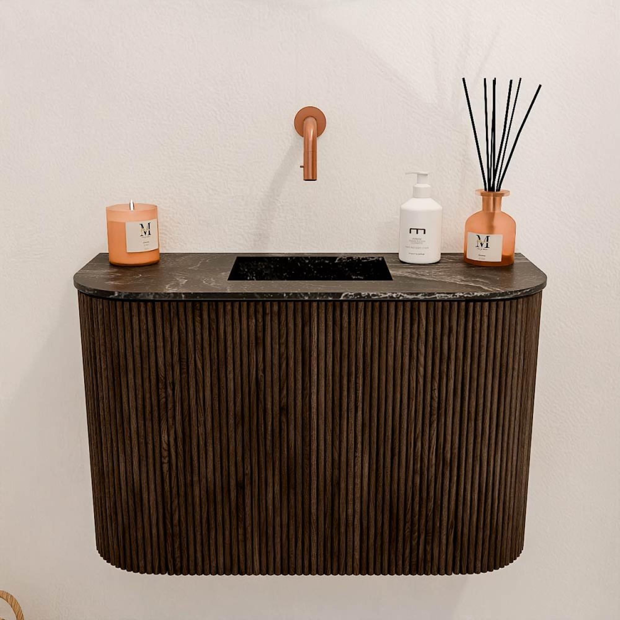 - Vasque Faye couleur lave, placée au centre sans trou de robinet pour une flexibilité maximale