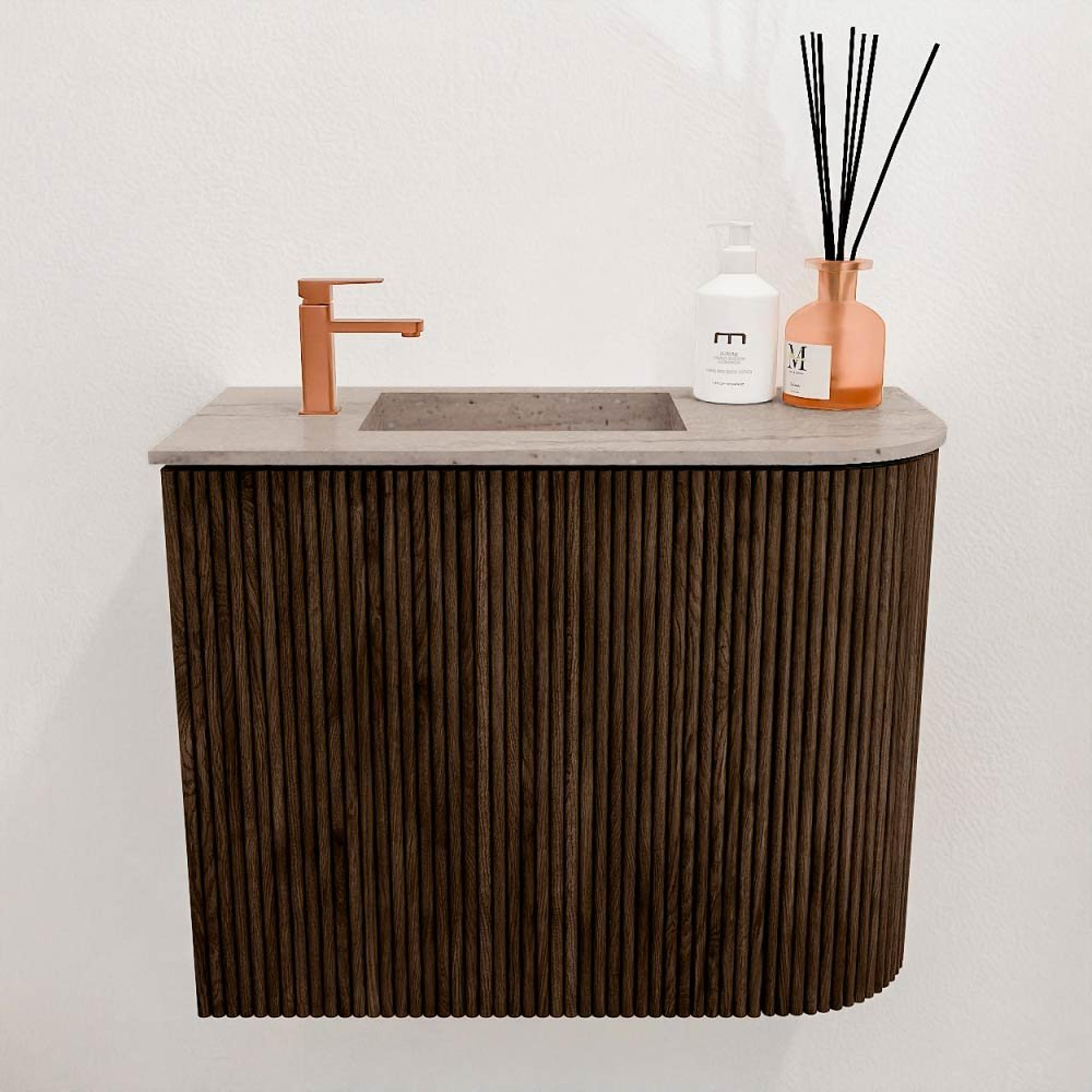 Avec sa finition noyer élégante et ses rainures verticales raffinées, ce meuble dégage une pure classe. La forme arrondie sur le côté droit lui confère un caractère unique qui le distingue des meubles de salle de bains standards. Vous ajoutez ainsi non seulement un élément fonctionnel, mais aussi un véritable point focal qui améliore immédiatement l'ambiance de votre salle de bains. L'association de matériaux naturels et d'un design moderne permet au meuble de s'intégrer facilement à divers styles d'intérieur, du classique au contemporain.