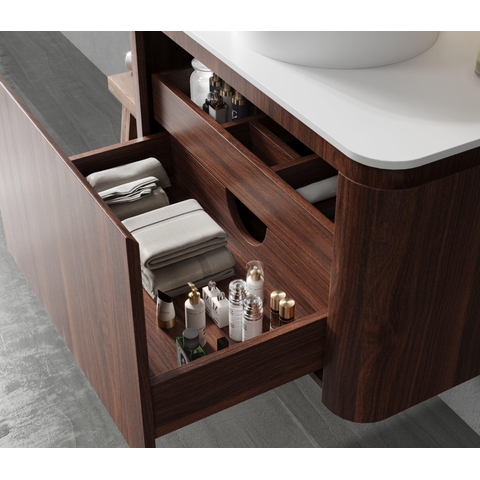 Élégance chaleureuse avec finesse arrondie Le meuble de salle de bains Saniclass Terra de 80 cm en châtaignier (noyer) dégage chaleur et raffinement. Avec ses coins arrondis et sa teinte bois profonde, ce meuble ajoute une touche de luxe à votre salle de bains. Le look noyer offre un caractère naturel et élégant, tandis que le plan vasque en solid surface blanc apporte un contraste moderne et frais.