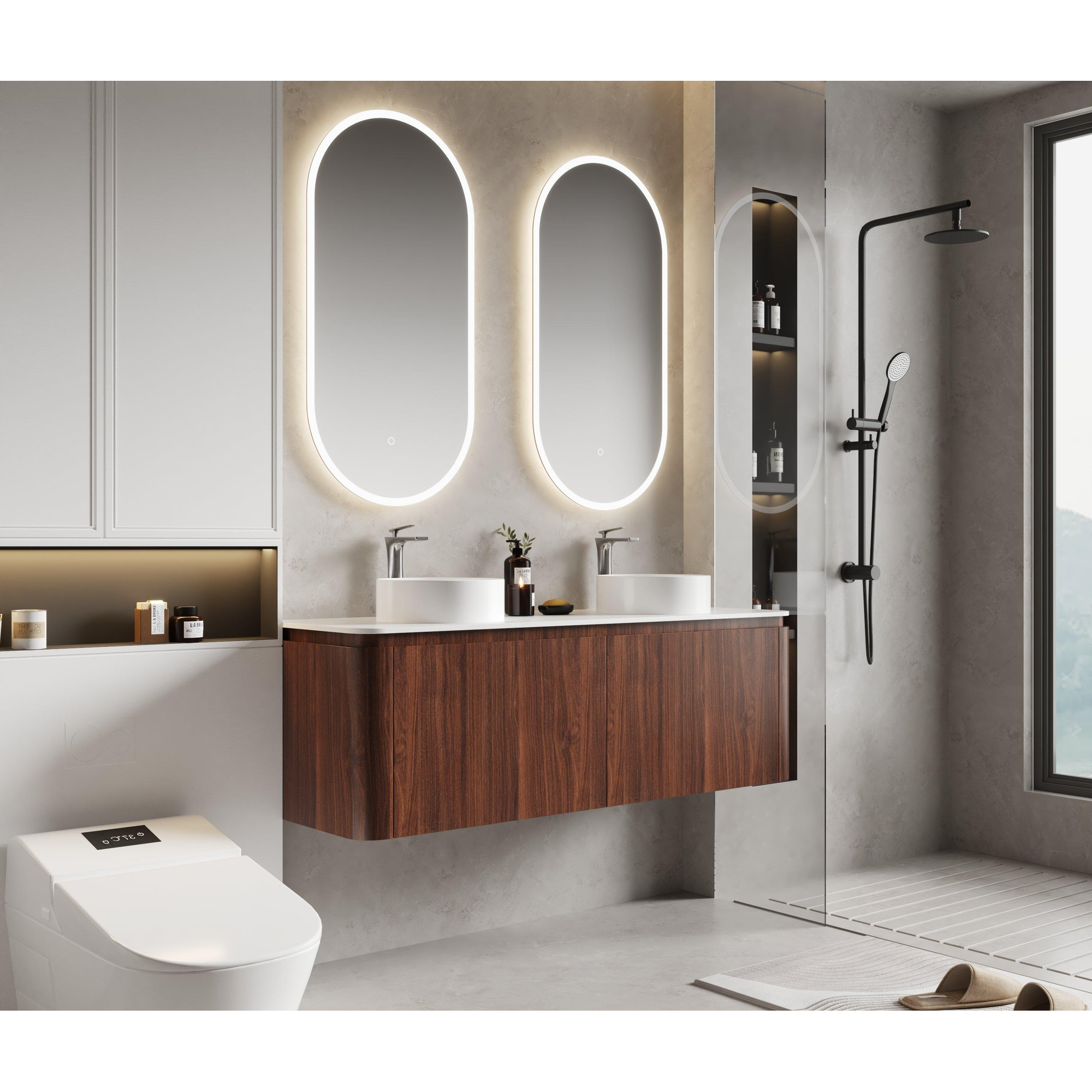 Luxe élégant avec une teinte bois chaleureuse Le meuble de salle de bains Saniclass Terra de 140 cm en châtaignier (noyer) offre un équilibre parfait entre design et fonctionnalité. Le décor noyer profond dégage chaleur et élégance, tandis que les coins arrondis apportent une apparence raffinée et douce. Le plan de toilette mat blanc en solid surface complète l’ensemble avec un contraste moderne.