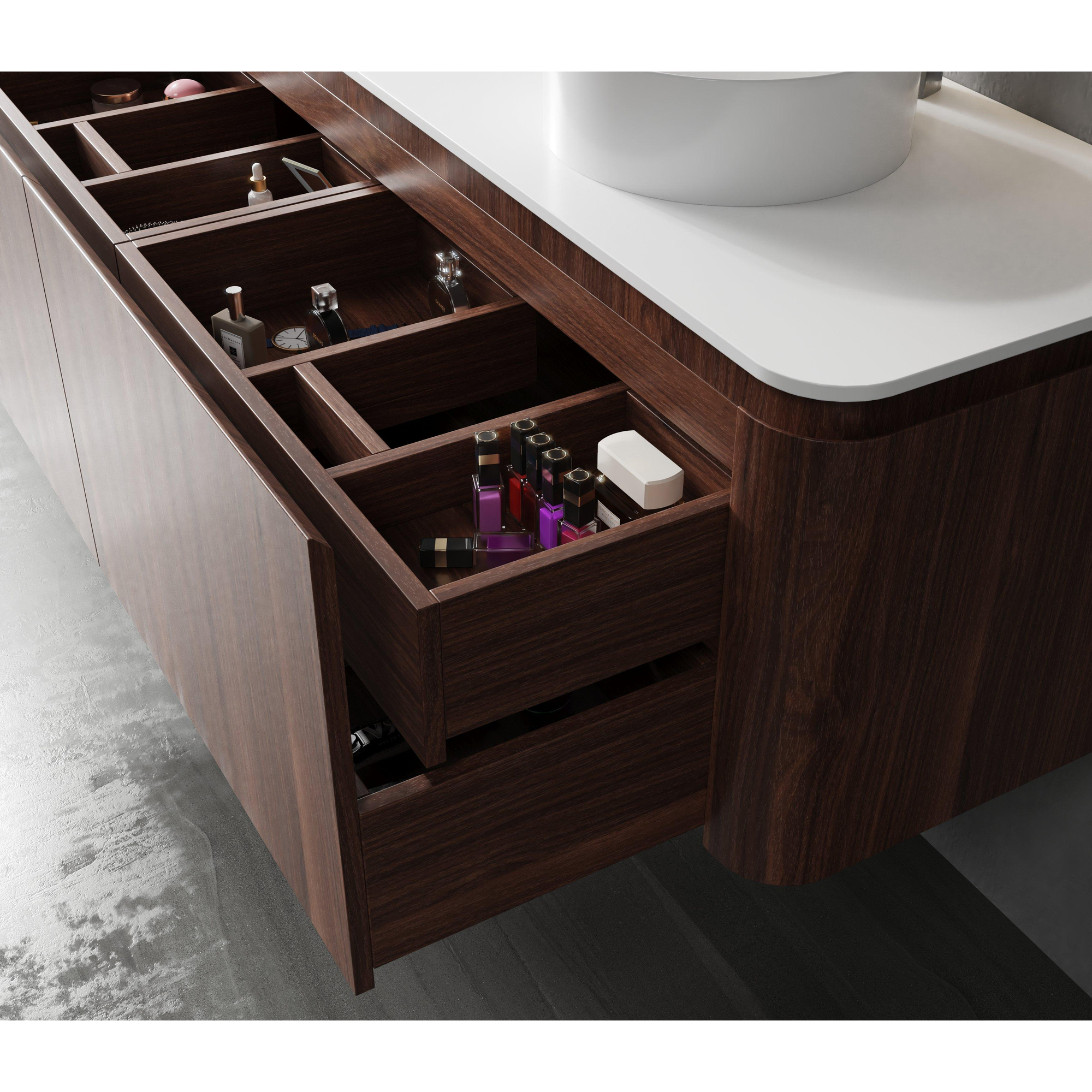 De l’espace pour tout et tous Avec quatre grands tiroirs à fermeture douce, ce meuble offre un espace de rangement exceptionnel. Les poignées intégrées assurent un aspect épuré sans interruptions. Grâce aux deux découpes pour siphon, cet ensemble est parfaitement adapté pour deux vasques – idéal pour une utilisation simultanée par plusieurs personnes.