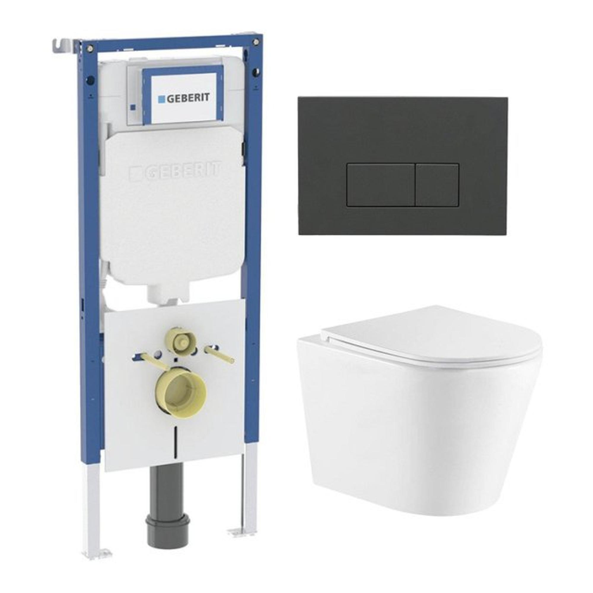 QeramiQ Dely Pack WC - 36.3x51.7cm - à fond creux - sans bride - réservoir attenant Geberit UP720 - abattant WC à fermeture douce - plaque de commande noire mate - boutons ronds - noir mat