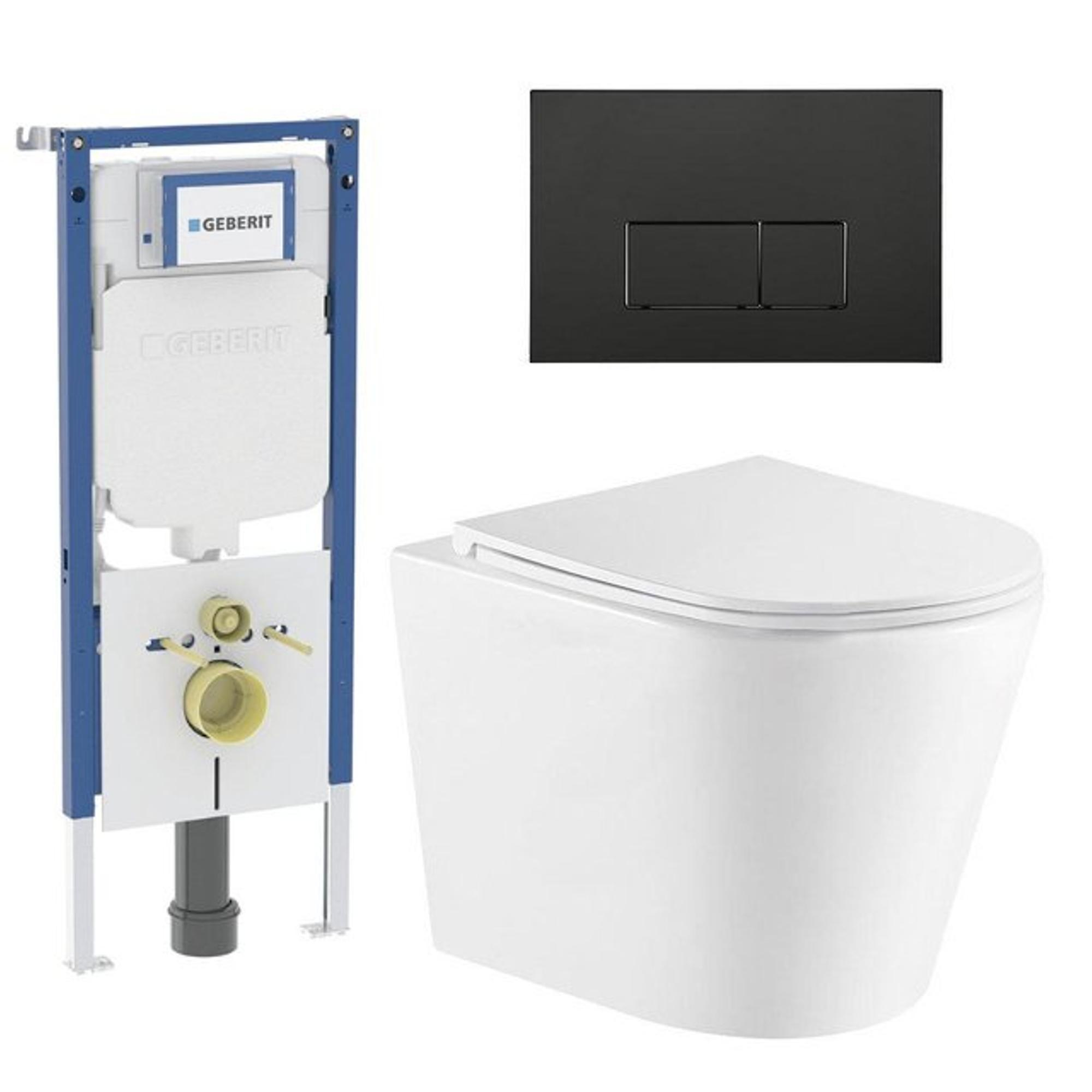 QeramiQ Dely Pack WC - 36.3x51.7cm - à fond creux - sans bride - réservoir WC attenant Geberit UP720 - abattant WC à fermeture douce - plaque de commande noire mate - boutons rectangulaires - blanc mat