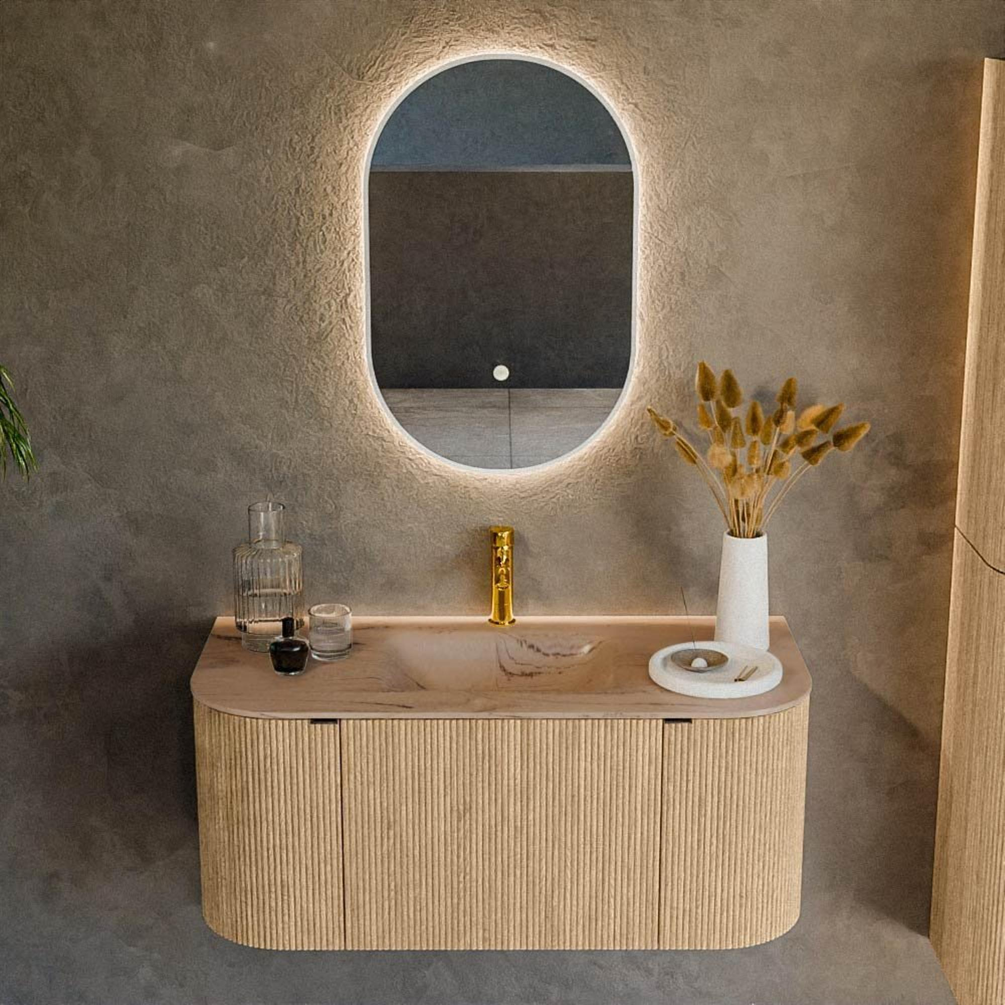 MONDIAZ KURVE-DLUX Meuble de salle de bains 100cm arrondi Gauche + Droite couleur Chêne avec 1 tiroir et 2 portes. Lavabo GRUNNE Central 1 trou de robinet Arena.