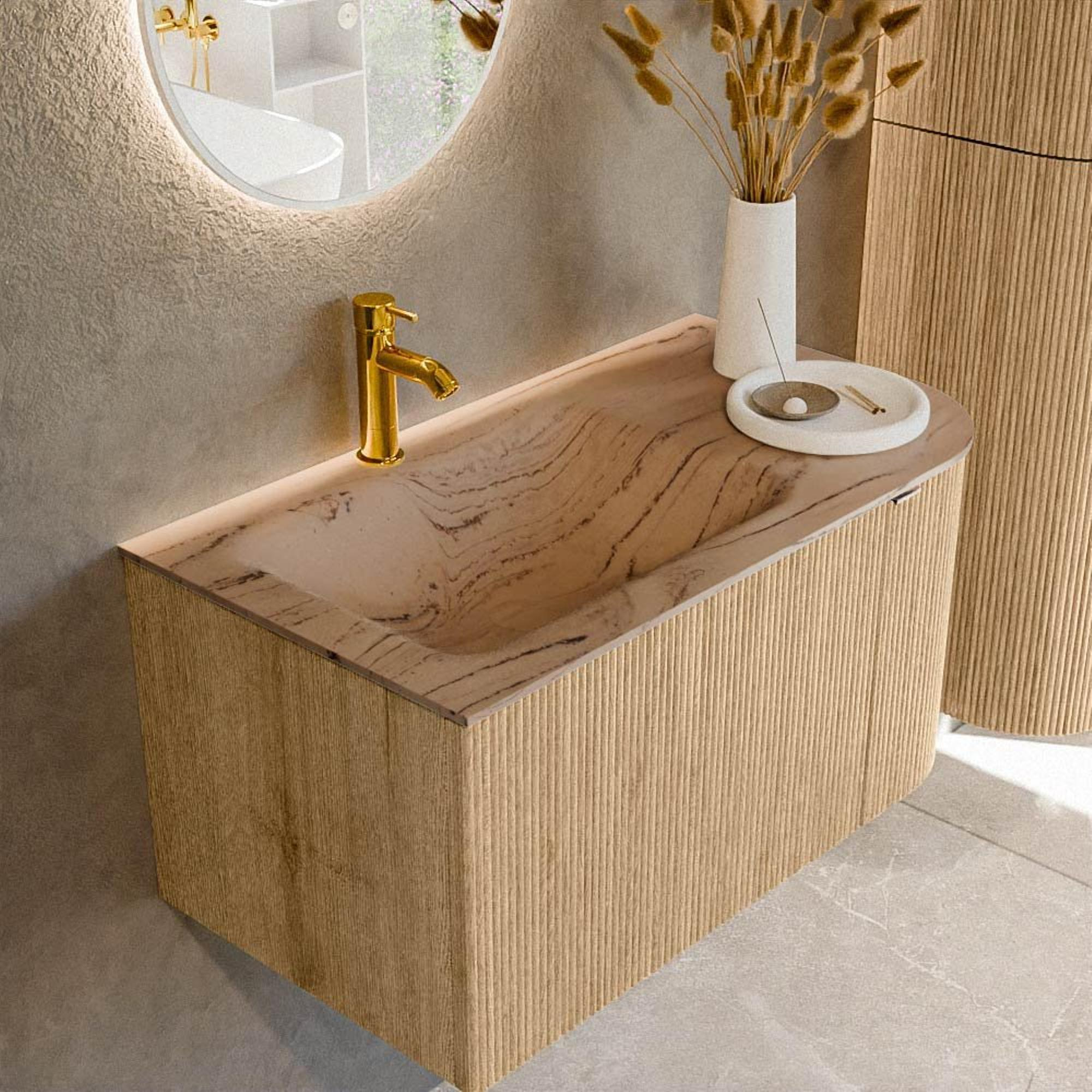 La façade avec structure à nervures verticales en couleur chêne donne immédiatement à votre salle de bains une apparence élégante et haut de gamme. L’arrondi subtil sur le côté droit adoucit les lignes épurées et vous permet de passer plus facilement le long du meuble, ce qui est particulièrement agréable dans les passages plus étroits. La teinte bois chaleureuse se combine facilement avec des carreaux blancs, couleur sable ou gris, mais aussi avec des robinets noirs ou en laiton pour une touche de luxe supplémentaire. Grâce à la forme rectangulaire aux angles arrondis, l’ensemble paraît moderne, mais jamais froid. Vous créez ainsi un meuble de salle de bains qui fait réellement partie intégrante de l’aménagement intérieur, au lieu d’être seulement un objet fonctionnel.