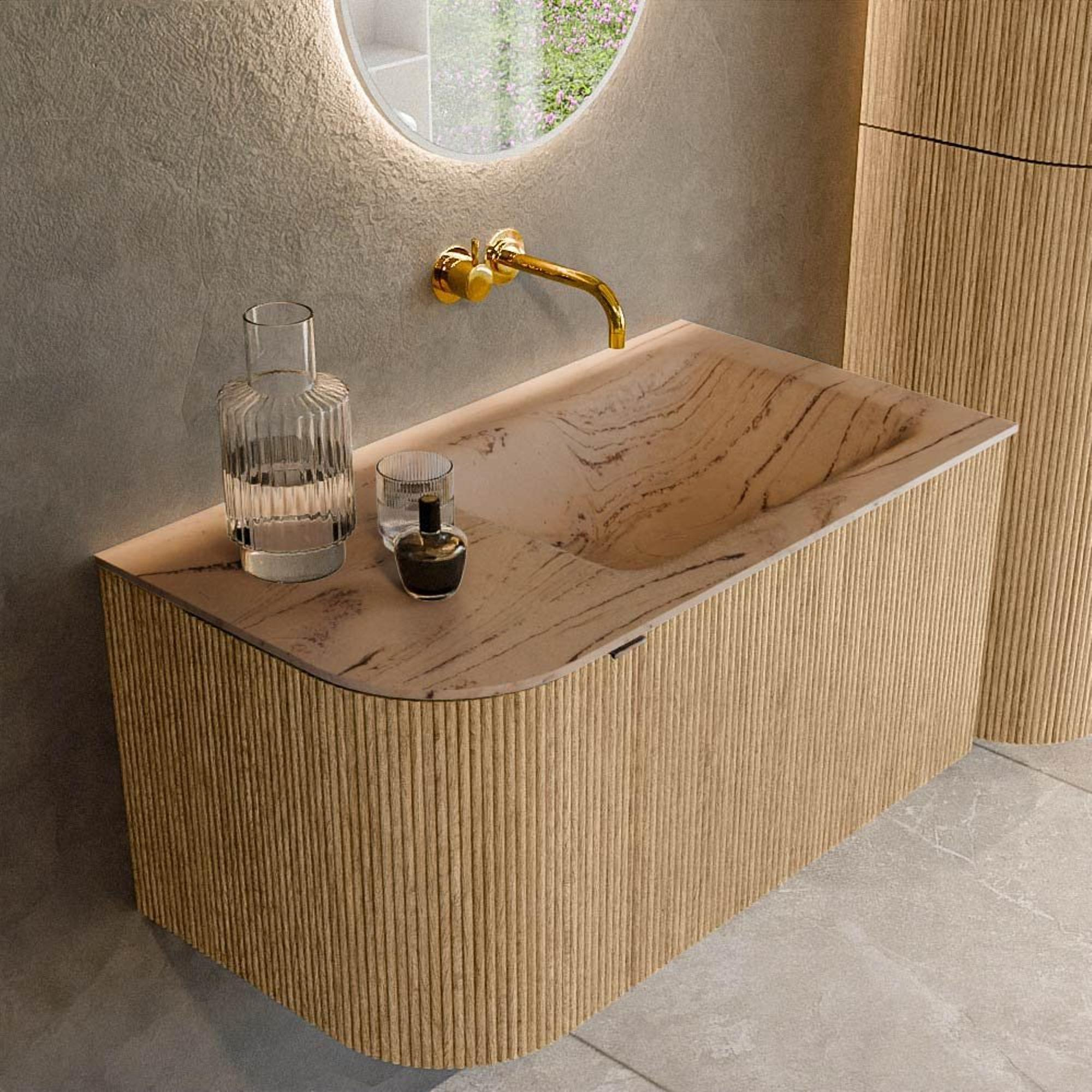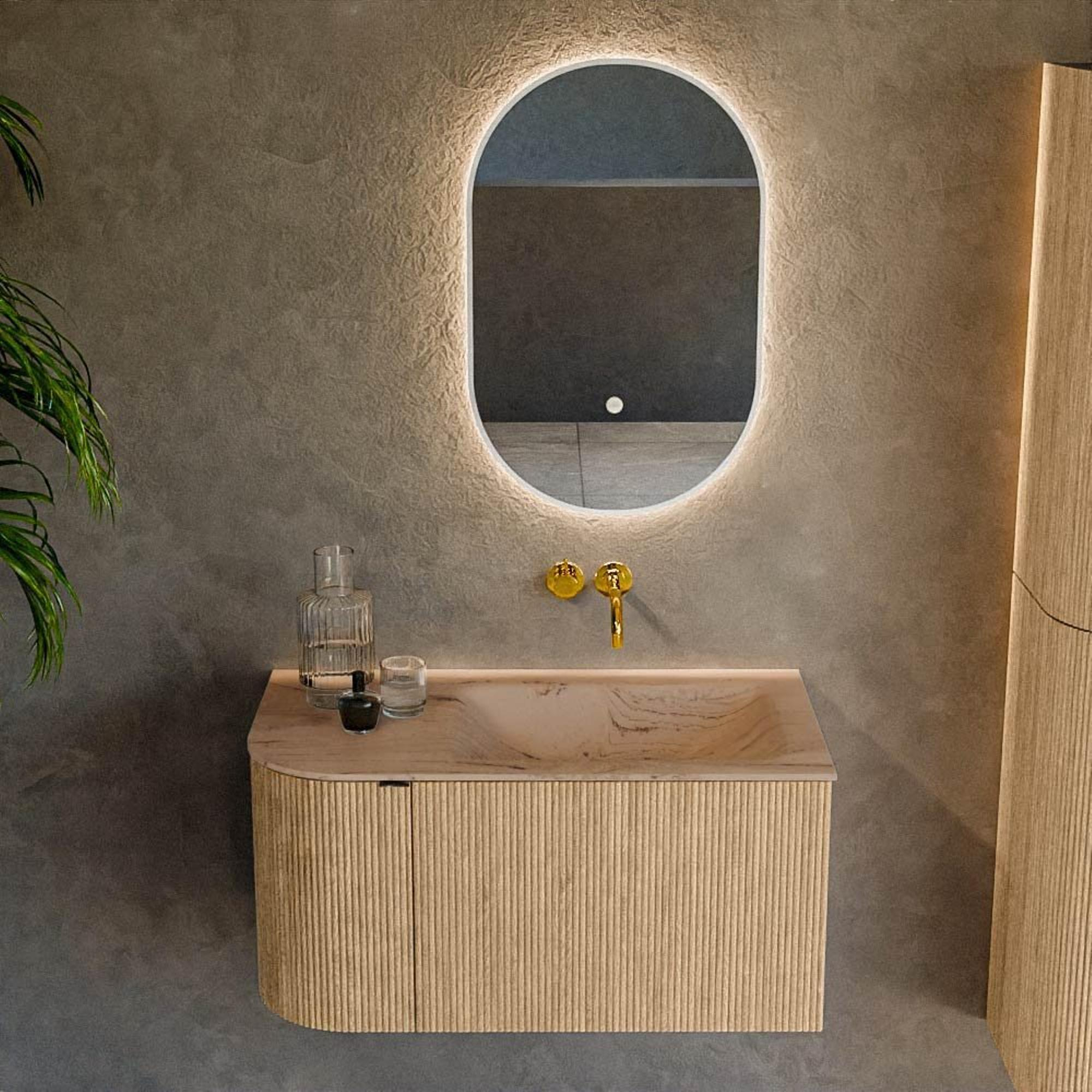 La forme arrondie sur le côté gauche donne à ce meuble une apparence raffinée, presque organique, qui attire immédiatement le regard dès que vous entrez dans la salle de bains. La couleur oak crée une ambiance chaleureuse et naturelle et se combine facilement avec la robinetterie blanche, les carreaux effet béton ou les accents noirs. Grâce aux façades rainurées avec texture verticale, le meuble gagne en profondeur et en caractère, comme si vous regardiez un véritable travail sur mesure. La configuration asymétrique avec le lavabo à droite n’est pas seulement élégante, mais aussi pratique dans les espaces où vous avez besoin de plus d’espace de circulation d’un côté. Vous créez ainsi une salle de bains digne d’un hôtel de luxe, mais chez vous.