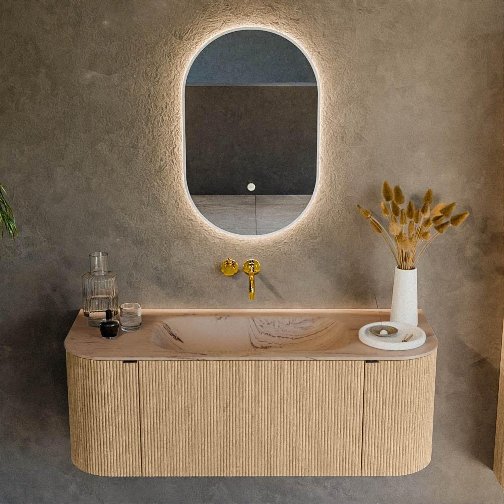 La couleur chêne et la structure nervurée de la façade confèrent à ce meuble un aspect très raffiné et naturel. Les coins arrondis à la fois sur le côté gauche et sur le côté droit adoucissent la forme, ce qui rend l’ensemble moins massif et lui permet de suivre joliment les lignes de votre espace. Cela rend le meuble idéal pour les salles de bains où vous souhaitez combiner une atmosphère chaleureuse et conviviale avec une apparence moderne. Les façades nervurées verticales apportent en outre une profondeur et un luxe supplémentaires sans donner un effet chargé. En combinaison avec la vasque Arena, il en résulte un ensemble harmonieux qui s’inscrit dans les tendances actuelles d’intérieur tout en restant suffisamment intemporel pour durer de nombreuses années.