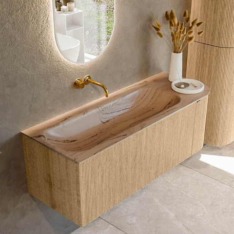 La courbure caractéristique sur le côté droit donne à ce meuble de salle de bains un look unique et offre en même temps un espace de circulation supplémentaire dans votre salle de bains. La forme est rectangulaire avec des coins arrondis, ce qui donne au meuble un aspect moderne sans être froid ou anguleux. La chaude teinte chêne et la façade cannelée verticale créent une atmosphère luxueuse, presque digne d’un hôtel, et apportent immédiatement structure et profondeur au mur de votre salle de bains. Comme le lavabo est positionné à gauche, vous conservez sur la droite plus d’espace de plan pour des accessoires, du savon, un joli vase ou le maquillage de tous les jours. Cette configuration asymétrique est idéale si votre salle de bains est un peu étroite, ou si la porte ou la douche se trouve à proximité et que vous souhaitez tout de même pouvoir vous déplacer confortablement sans heurter d’angles vifs.