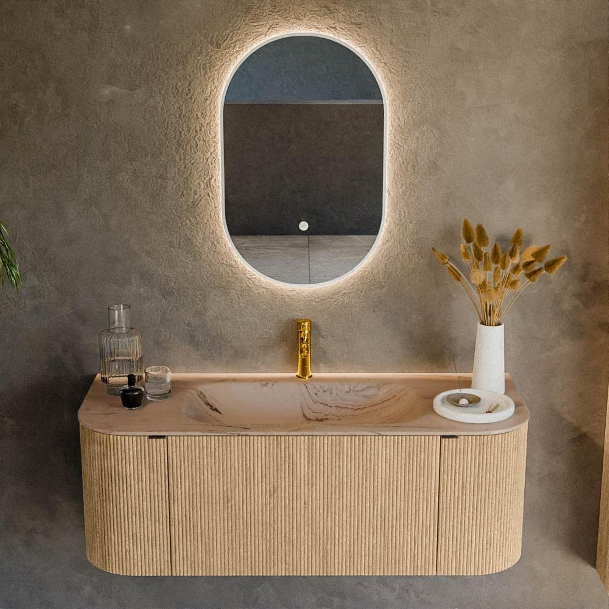 La couleur Chêne donne immédiatement à votre salle de bains une apparence chaude et naturelle et se marie facilement aussi bien avec des carreaux effet béton qu'avec des murs blancs épurés. La forme rectangulaire aux angles arrondis rend l'ensemble plus accueillant et plus sûr, surtout dans les petits espaces ou avec de jeunes enfants. La couleur Arena de la vasque s'accorde subtilement au bois, créant ainsi une palette ton sur ton apaisante plutôt que des contrastes marqués. La structure à nervures verticales sur la partie frontale apporte une profondeur et un caractère supplémentaires, faisant de ce meuble un véritable accroche-regard sans être criard. Vous créez ainsi un meuble de salle de bains qui non seulement est beau aujourd'hui, mais restera aussi élégant dans les années à venir.