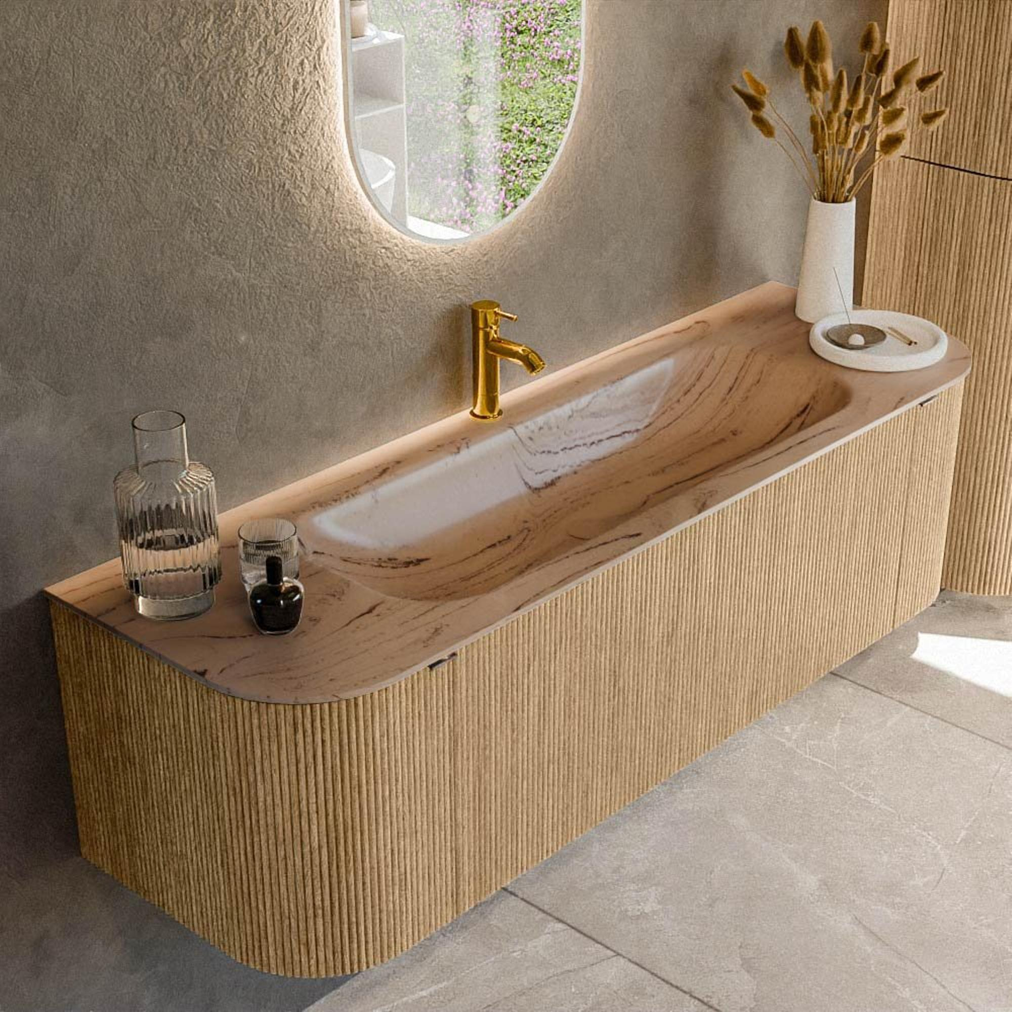 MONDIAZ KURVE-DLUX Meuble de salle de bains 150cm arrondi gauche + droite couleur Oak avec 1 tiroir et 2 portes. Lavabo BIG MEDIUM central 1 trou de robinet Arena.
