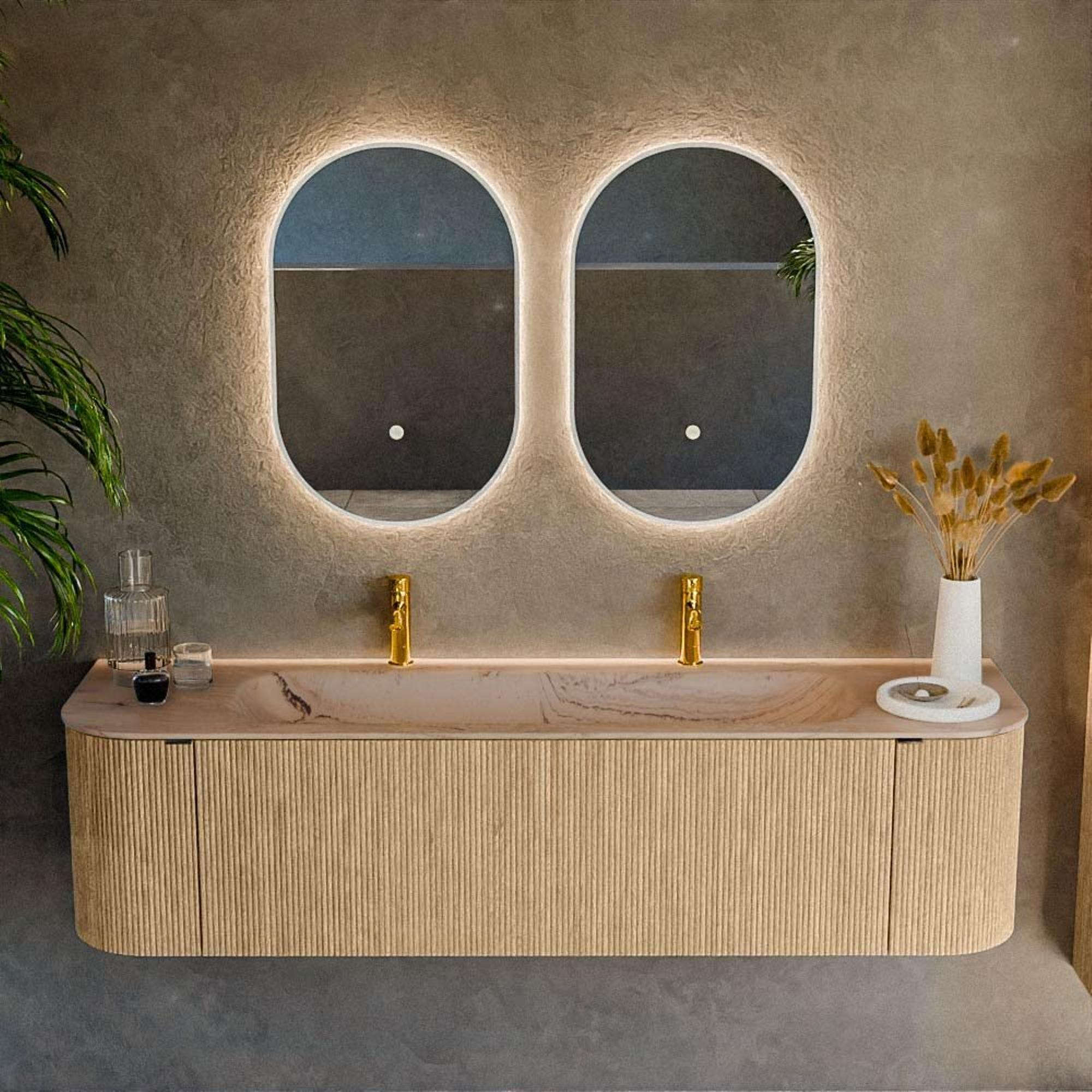 La combinaison de la couleur Chêne chaleureuse, de la façade rainurée verticale et des courbes subtiles des deux côtés donne immédiatement à votre salle de bains une allure luxueuse et moderne. Les façades 3D apportent profondeur et caractère, sans que l’ensemble paraisse chargé. Les angles arrondis ne sont pas seulement esthétiques, mais aussi pratiques : vous vous cognez moins vite à un angle vif et cela donne une sensation de sécurité, en particulier dans une salle de bains familiale. Comme le lavabo est placé au centre, il se crée à gauche et à droite un bel équilibre dans le jeu de lignes du meuble. Cela le rend facile à combiner aussi bien avec des salles de bains calmes et minimalistes qu’avec des espaces aux carreaux marqués ou aux accents de couleur prononcés. Les façades sans poignées à ouverture push-to-open s’intègrent parfaitement dans un aménagement moderne et épuré.
