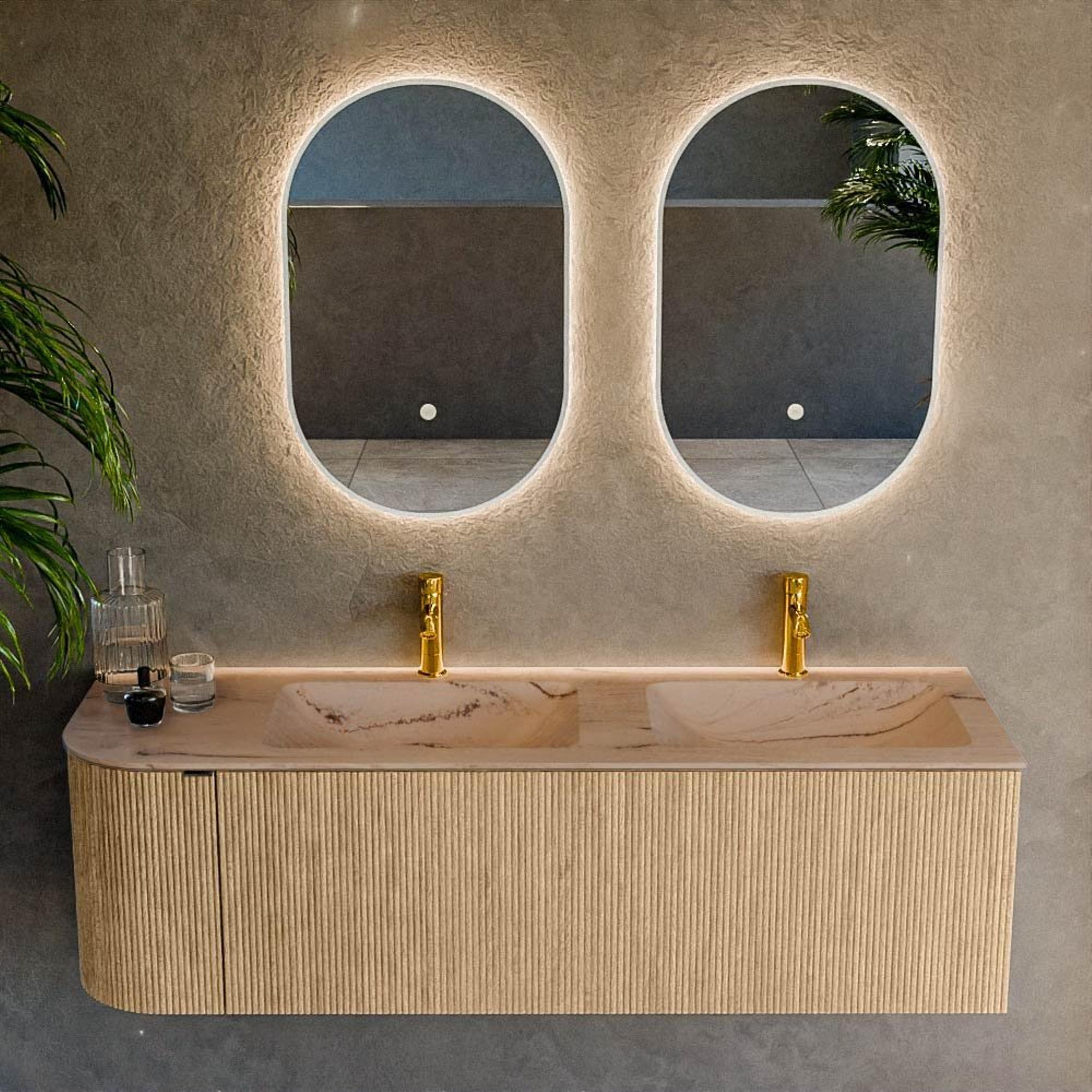 MONDIAZ KURVE-DLUX 145cm badmeubel ronding Links kleur Oak met 1 lade en 1 deur. Wastafel LEAF Dubbel / Rechts 2 kraangaten Arena.