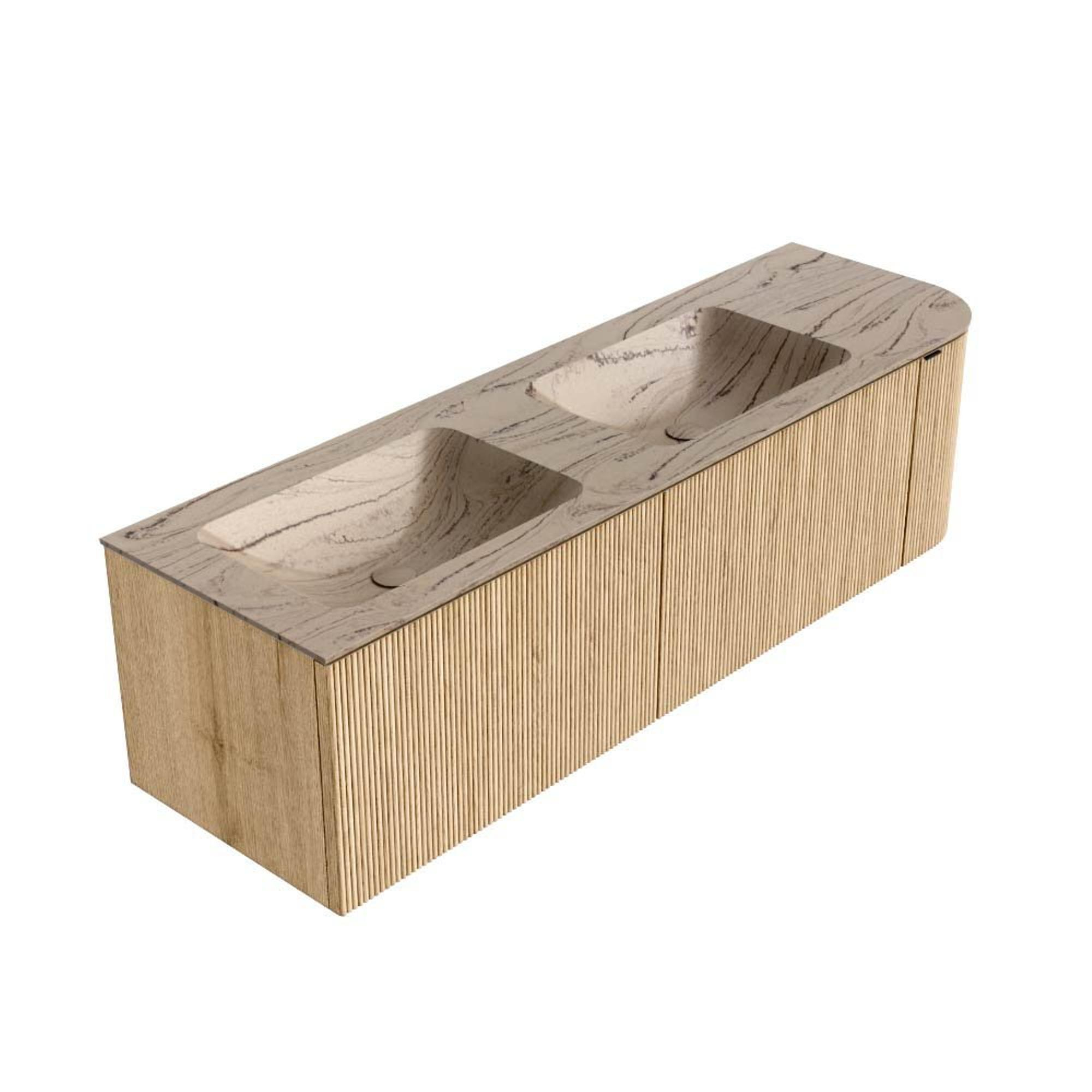MONDIAZ KURVE-DLUX 155cm badmeubel ronding Rechts kleur Oak met 2 lades en 1 deur. Wastafel LEAF Dubbel / Links 2 kraangaten Arena.
