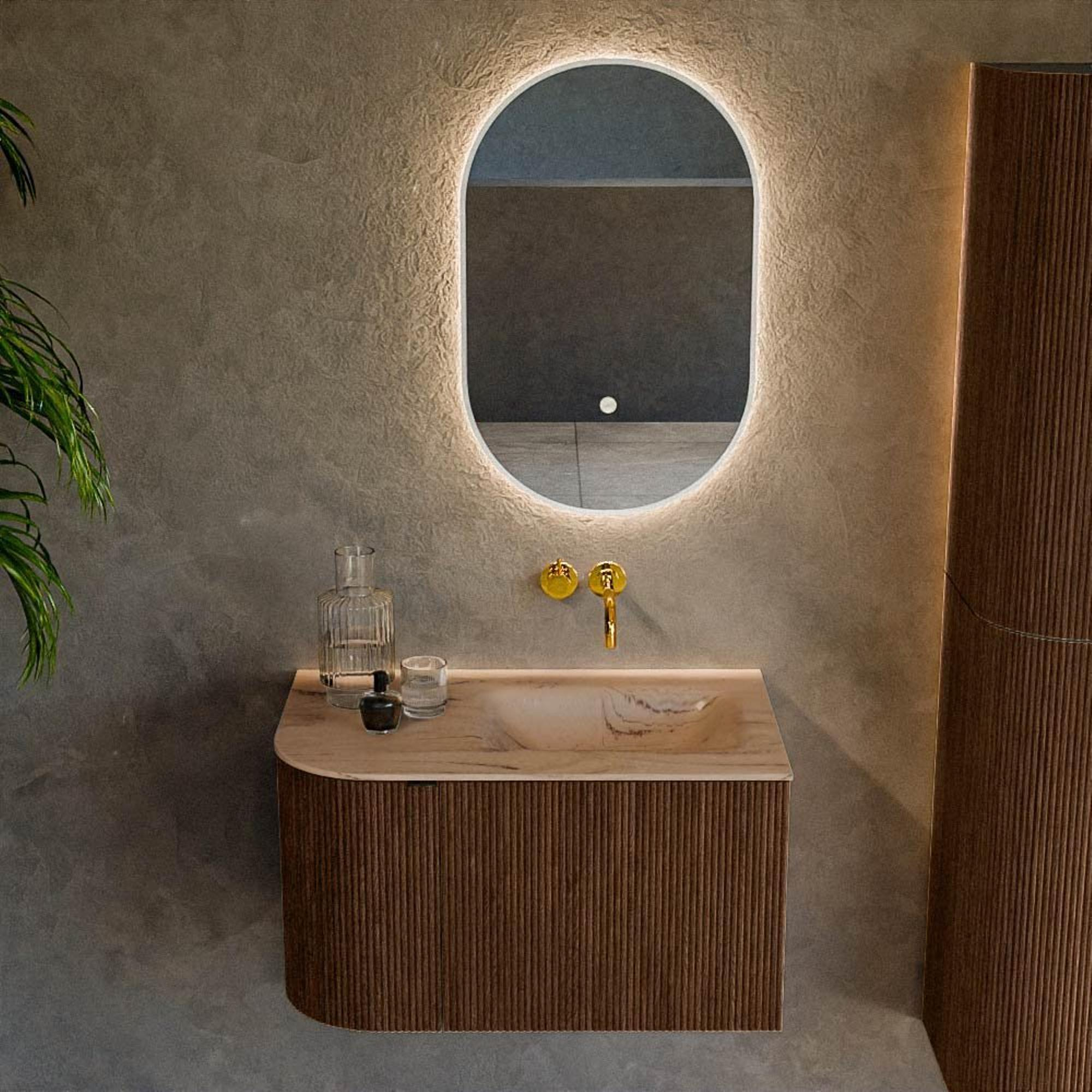 L’arrondi caractéristique sur le côté gauche donne à ce meuble un aspect plus doux et plus organique qu’un modèle rectangulaire standard. Ce n’est pas seulement esthétique, mais aussi pratique : l’angle arrondi est plus agréable au toucher dans un passage étroit et évite les angles vifs sur votre trajet. La cuve du lavabo se trouve à droite, ce qui rend ce design parfait pour les salles de bains où l’espace se situe de ce côté, par exemple à côté d’une paroi de douche ou d’une niche. La combinaison de la forme asymétrique, de la façade épurée sans poignées et du devant rainuré avec lignes verticales crée un look luxueux digne d’un intérieur qui rehausse immédiatement le niveau de votre salle de bains.