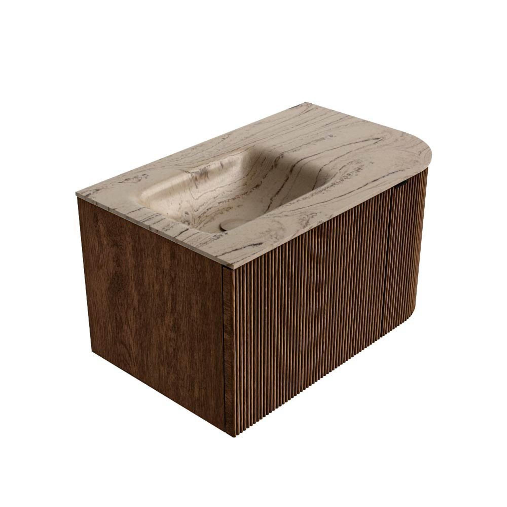 MONDIAZ KURVE-DLUX 75cm badmeubel ronding Rechts kleur Walnut met 1 lade en 1 deur. Wastafel GRUNNE Links zonder kraangat Arena.