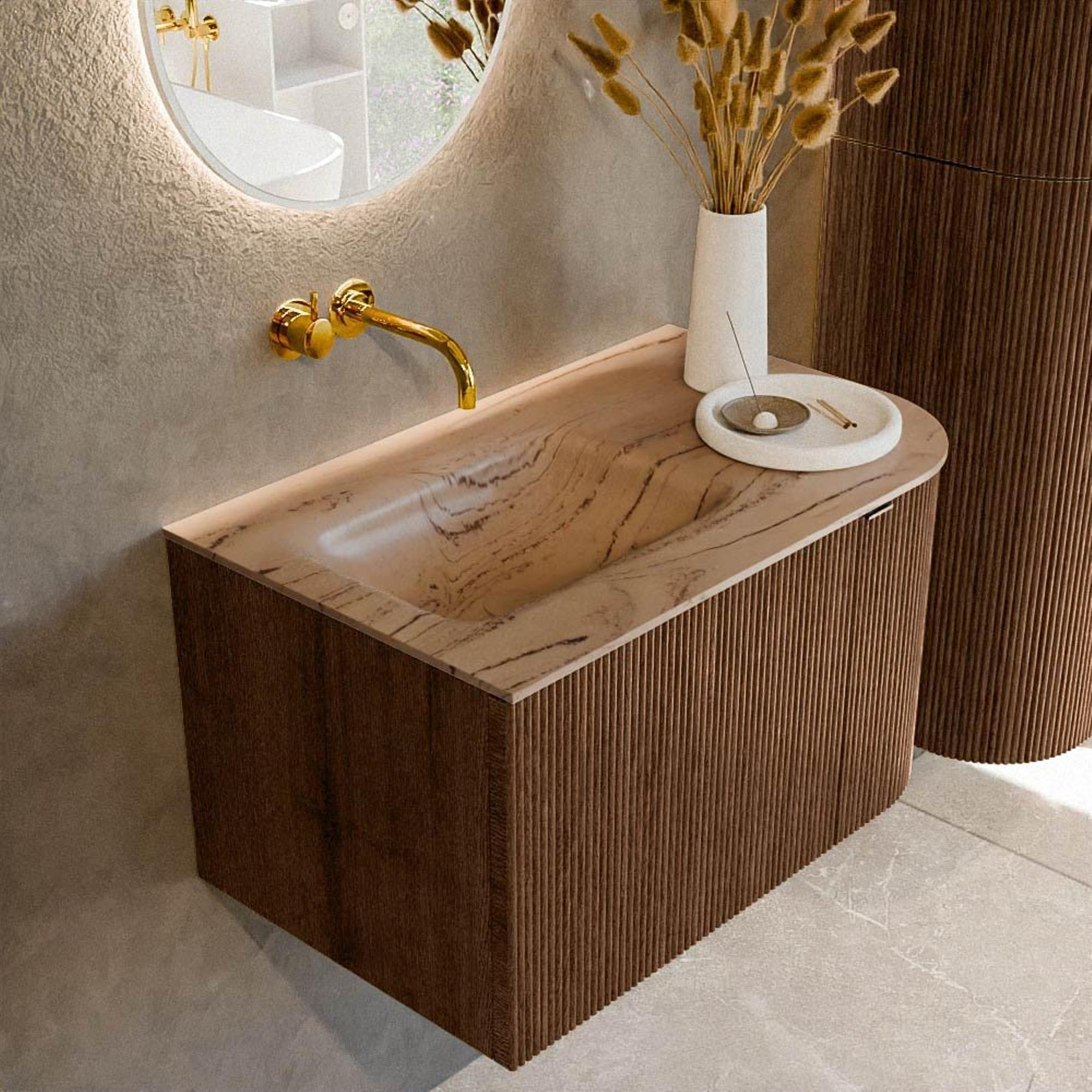 La teinte walnut chaleureuse avec structure bois apporte immédiatement de l’ambiance à votre salle de bains et fait de ce meuble un véritable accroche-regard. La structure nervurée verticale sur la façade crée une profondeur et un luxe supplémentaires, donnant à l’ensemble un aspect raffiné et sur mesure. L’arrondi doux sur le côté droit rompt les lignes droites de la pièce et rend le meuble idéal le long d’un passage ou à côté d’une paroi de douche, car vous vous cognez moins facilement. Grâce à la largeur compacte de 75 cm, il s’intègre parfaitement dans les salles de bains de taille moyenne ou comme meuble chic dans un espace WC généreux, sans sacrifier l’esthétique.