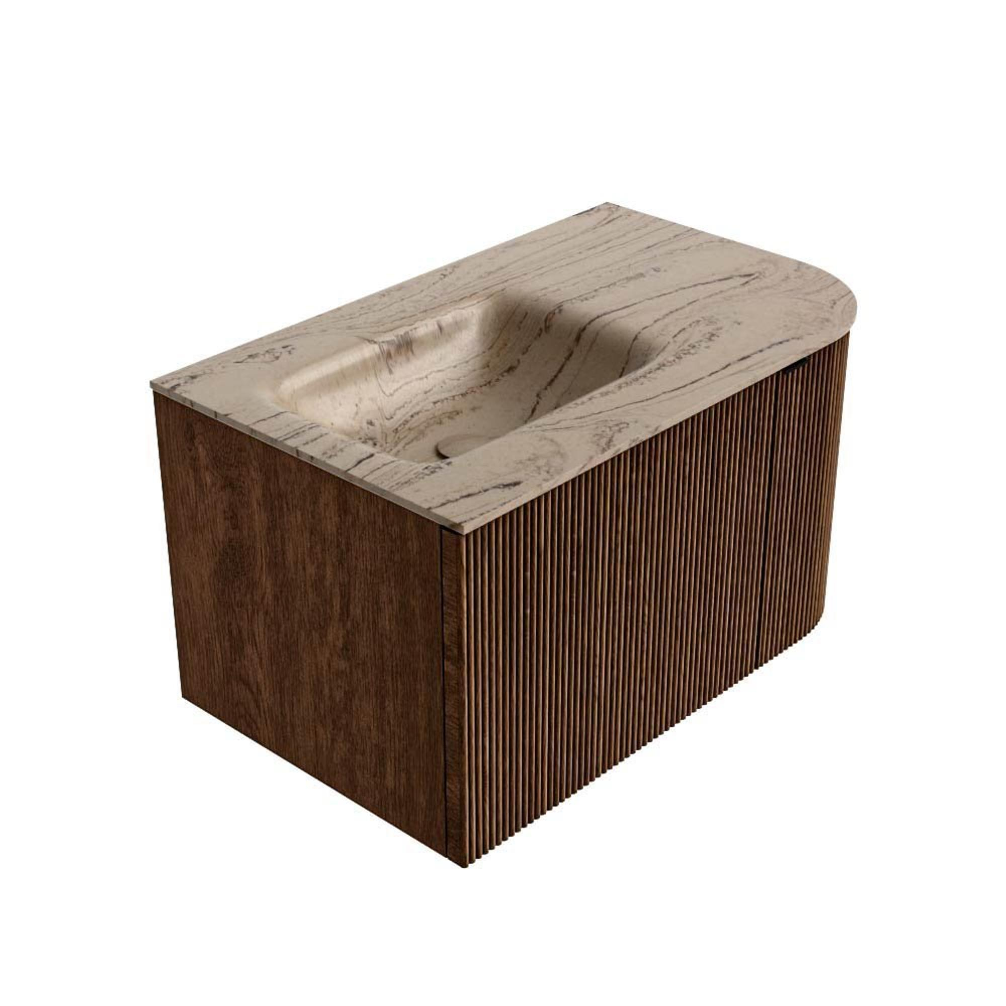 MONDIAZ KURVE-DLUX Meuble de salle de bains 75cm arrondi à droite couleur Noyer avec 1 tiroir et 1 porte. Lavabo GRUNNE à gauche 1 trou de robinet Arena.