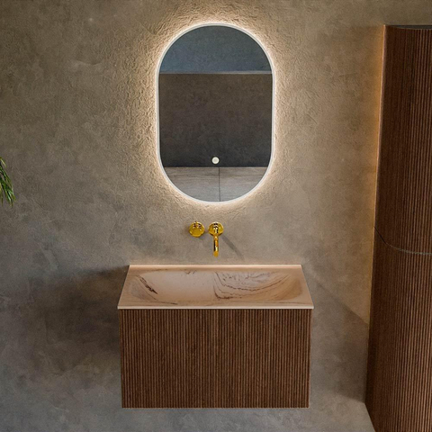 Vous recherchez un meuble de salle de bains compact mais luxueux qui donne immédiatement une apparence raffinée à votre salle de bains ? Ce meuble élégant est idéal pour les salles de bains modernes et design, mais s'intègre également parfaitement dans un aménagement intemporel ou de style hôtel chic. Grâce à sa largeur de 70 cm, c'est un choix astucieux aussi bien pour les petites salles de bains que pour les grandes salles de bains où vous souhaitez combiner plusieurs meubles. La teinte bois chaude crée une atmosphère conviviale, tandis que les lignes épurées et le plan vasque intégré apportent un aspect calme et ordonné. Le tiroir pratique offre amplement d'espace pour vos produits de salle de bains quotidiens, de sorte que le plan reste dégagé et que votre salle de bains ait toujours l'air soignée. Vous aimez choisir vous-même votre solution de robinetterie, par exemple un mitigeur sur plage ou encastré noir ou laiton ? Alors le lavabo sans trou de robinet s'y prête parfaitement.