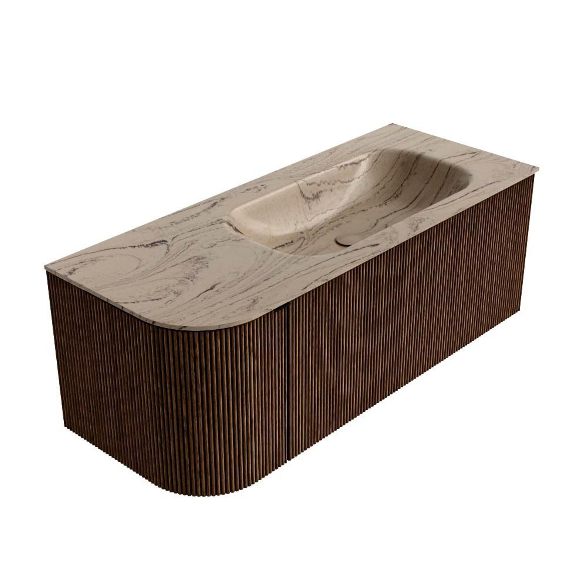 MONDIAZ KURVE-DLUX Meuble de salle de bains 115cm arrondi à gauche couleur Walnut avec 1 tiroir et 1 porte. Lavabo BIG SMALL à droite 1 trou de robinet Arena.