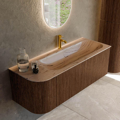 L’arrondi sur le côté gauche et la forme rectangulaire aux angles arrondis confèrent à ce meuble de salle de bains un caractère accueillant et luxueux. La couleur walnut et la façade rainurée verticale assurent une apparence riche et naturelle qui apporte immédiatement de l’ambiance dans votre salle de bains. Grâce à la ligne horizontale de 125 cm de large, le meuble paraît élancé, tandis que les formes arrondies adoucissent visuellement l’espace. Cela en fait un excellent choix si vous souhaitez donner un peu plus de chaleur et de caractère à une salle de bains moderne, sans renoncer à une esthétique globale épurée. L’aspect bois s’accorde à merveille avec des robinets noirs, des murs blancs ou au contraire des tons terre chaleureux, ce qui vous permet de créer facilement un design de salle de bains harmonieux.