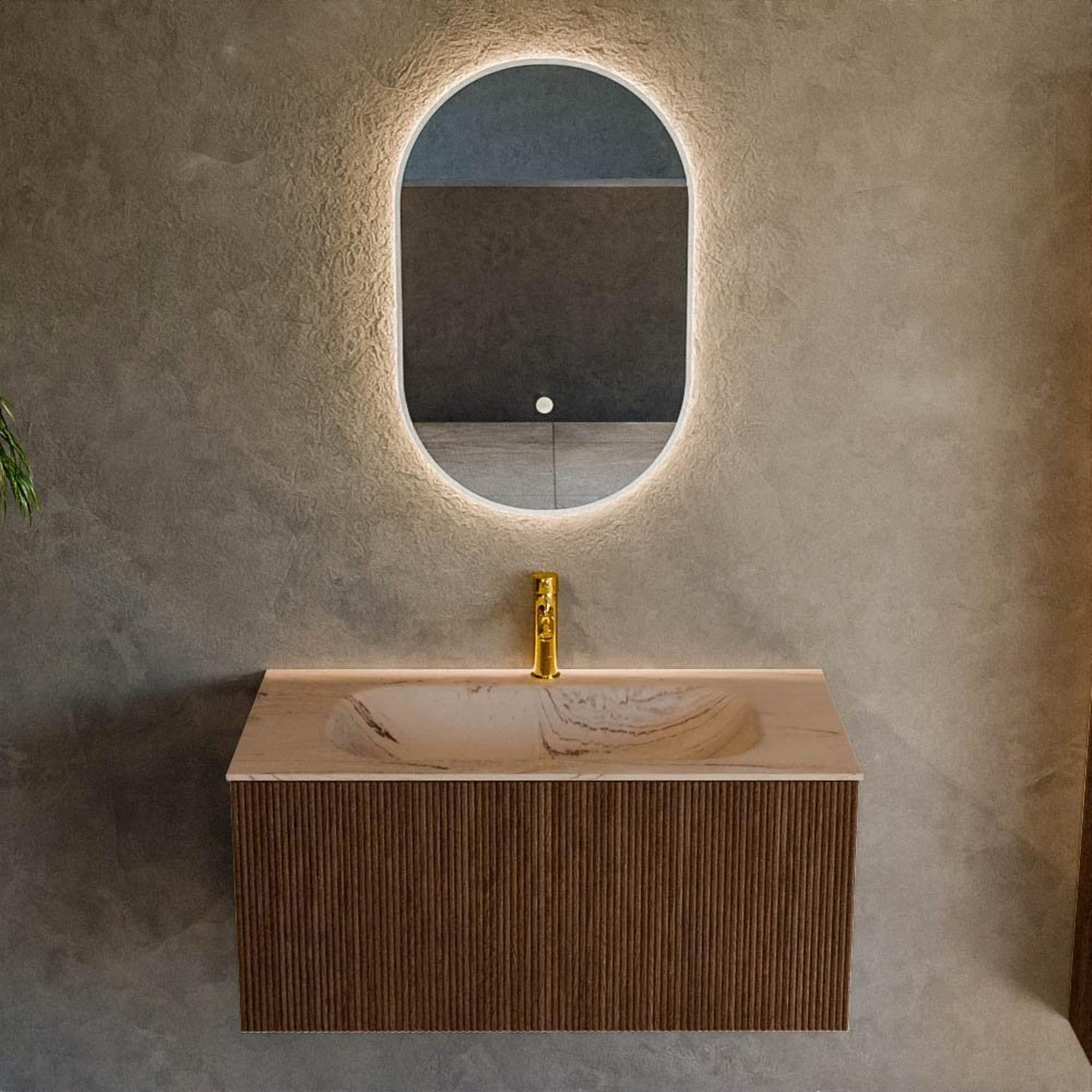 La couleur noyer avec structure à rainures verticales donne immédiatement à votre salle de bains un aspect exclusif et axé sur le design. Le décor bois se prolonge harmonieusement sur la façade et les côtés, donnant au meuble une apparence uniforme et épurée. Les façades à rainures créent de la profondeur et un jeu de lumière ludique, tout en conservant un aspect calme grâce aux lignes horizontales du meuble. Cet ensemble s'intègre ainsi parfaitement dans les salles de bains modernes, hôtel chic et scandinaves. Associez-le à un miroir sobre et à des robinets noirs, chromés ou en métal brossé pour un ensemble complet et intemporel qui donnera à votre salle de bains une apparence haut de gamme pendant de nombreuses années.
