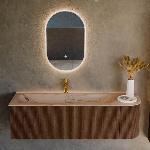 La couleur walnut chaude avec relief bois apporte immédiatement plus d’ambiance et de caractère à votre salle de bains. La structure à nervures verticales sur la face avant crée de la profondeur et une touche luxueuse, donnant au meuble l’apparence d’une réalisation sur mesure. Le côté arrondi droit adoucit les lignes de la pièce et est idéal lorsque vous devez passer le long du meuble
